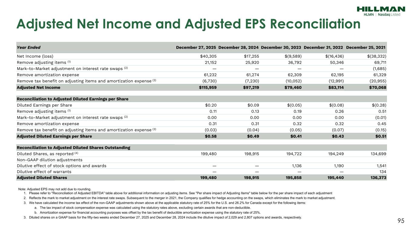 #26673F #102F93 #279A56 #4EA72E#239FFF #0E2841 #279A56 #4EA72E Adjusted Net Income and Adjusted EPS Reconciliation 95 text Note: Adjusted EPS may not add due to rounding. 1. Please refer to "Reconciliation of Adjusted EBITDA" table above for additional information on adjusting items. See "Per share impact of Adjusting Items" table below for the per share impact of each adjustment 2. Reflects the mark to market adjustment on the interest rate swaps. Subsequent to the merger in 2021, the Company qualifies for hedge accounting on the swaps, which eliminates the mark to market adjustment. 3. We have calculated the income tax effect of the non-GAAP adjustments shown above at the applicable statutory rate of 25% for the U.S. and 26.2% for Canada except for the following items: a. The tax impact of stock compensation expense was calculated using the statutory rates above, excluding certain awards that are non-deductible. b. Amortization expense for financial accounting purposes was offset by the tax benefit of deductible amortization expense using the statutory rate of 25%. 3. Diluted shares on a GAAP basis for the fifty-two weeks ended December 27, 2025 and December 28, 2024 include the dilutive impact of 2,029 and 2,807 options and awards, respectively. Year Ended December 27, 2025 December 28, 2024 December 30, 2023 December 31, 2022 December 25, 2021 Net Income (loss) $40,305 $17,255 $(9,589) $(16,436) $(38,332) Remove adjusting items (1) 21,152 25,920 36,792 50,346 69,711 Mark-to-Market adjustment on interest rate swaps (2) — — — — (1,685) Remove amortization expense 61,232 61,274 62,309 62,195 61,329 Remove tax benefit on adjusting items and amortization expense (3) (6,730) (7,230) (10,052) (12,991) (20,955) Adjusted Net Income $115,959 $97,219 $79,460 $83,114 $70,068 Reconciliation to Adjusted Diluted Earnings per Share Diluted Earnings per Share $0.20 $0.09 $(0.05) $(0.08) $(0.28) Remove adjusting items (1) 0.11 0.13 0.19 0.26 0.51 Mark-to-Market adjustment on interest rate swaps (2) 0.00 0.00 0.00 0.00 (0.01) Remove amortization expense 0.31 0.31 0.32 0.32 0.45 Remove tax benefit on adjusting items and amortization expense (3) (0.03) (0.04) (0.05) (0.07) (0.15) Adjusted Diluted Earnings per Share $0.58 $0.49 $0.41 $0.43 $0.51 Reconciliation to Adjusted Diluted Shares Outstanding Diluted Shares, as reported (4) 199,480 198,915 194,722 194,249 134,699 Non-GAAP dilution adjustments Dilutive effect of stock options and awards — — 1,136 1,190 1,541 Dilutive effect of warrants — — — — 134 Adjusted Diluted Shares 199,480 198,915 195,858 195,440 136,373