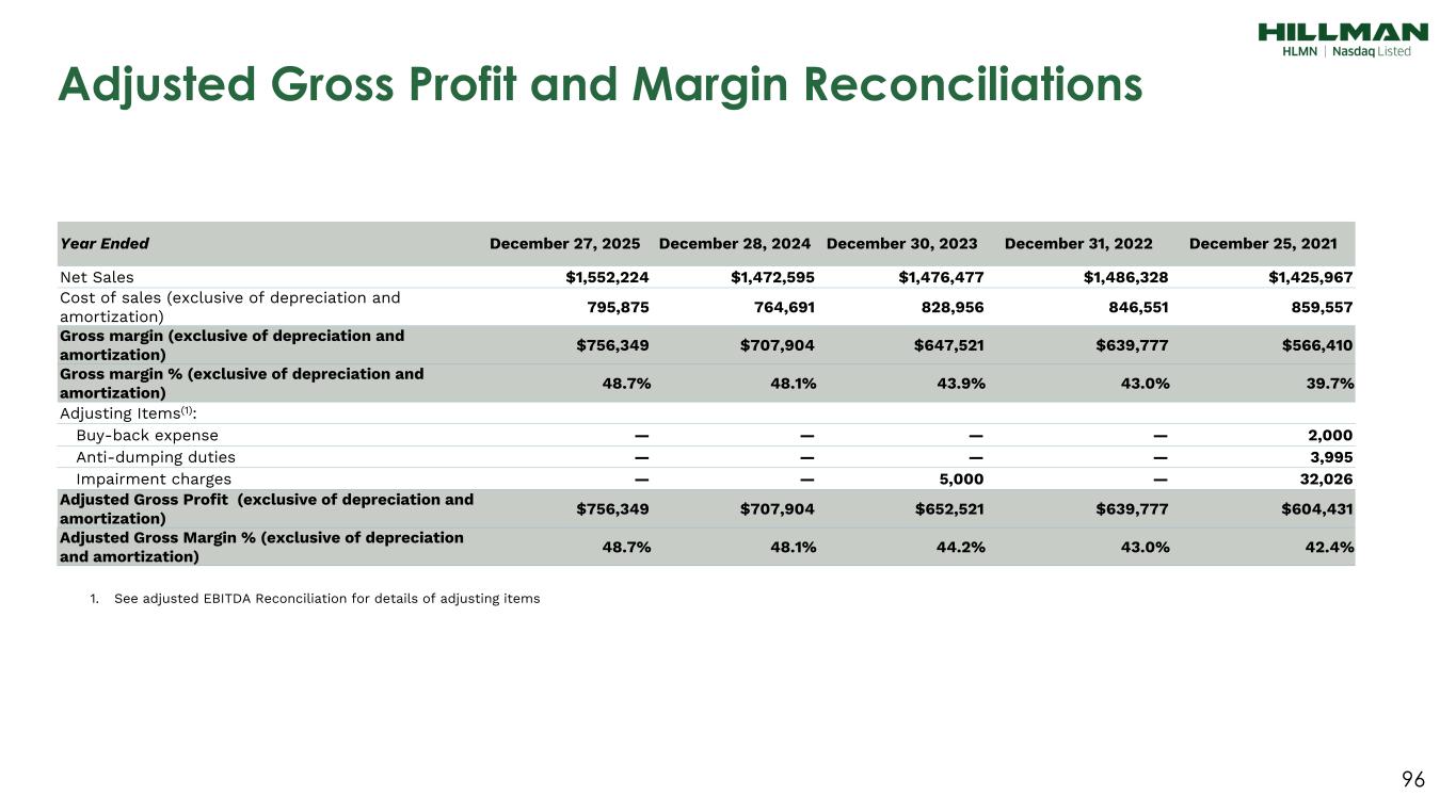 #26673F #102F93 #279A56 #4EA72E#239FFF #0E2841 #279A56 #4EA72E Adjusted Gross Profit and Margin Reconciliations 96 text 1. See adjusted EBITDA Reconciliation for details of adjusting items Year Ended December 27, 2025 December 28, 2024 December 30, 2023 December 31, 2022 December 25, 2021 Net Sales $1,552,224 $1,472,595 $1,476,477 $1,486,328 $1,425,967 Cost of sales (exclusive of depreciation and amortization) 795,875 764,691 828,956 846,551 859,557 Gross margin (exclusive of depreciation and amortization) $756,349 $707,904 $647,521 $639,777 $566,410 Gross margin % (exclusive of depreciation and amortization) 48.7% 48.1% 43.9% 43.0% 39.7% Adjusting Items(1): Buy-back expense — — — — 2,000 Anti-dumping duties — — — — 3,995 Impairment charges — — 5,000 — 32,026 Adjusted Gross Profit (exclusive of depreciation and amortization) $756,349 $707,904 $652,521 $639,777 $604,431 Adjusted Gross Margin % (exclusive of depreciation and amortization) 48.7% 48.1% 44.2% 43.0% 42.4%
