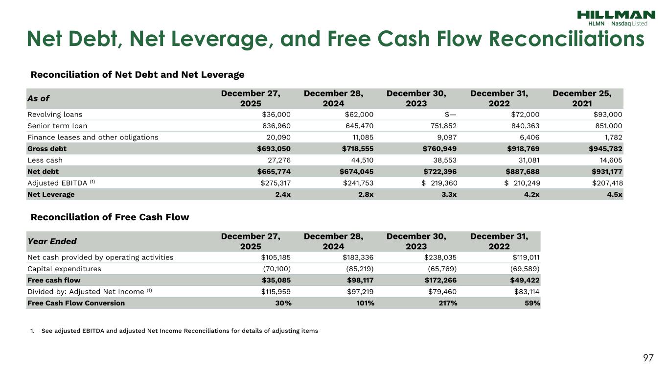 #26673F #102F93 #279A56 #4EA72E#239FFF #0E2841 #279A56 #4EA72E Net Debt, Net Leverage, and Free Cash Flow Reconciliations 97 text As of December 27, 2025 December 28, 2024 December 30, 2023 December 31, 2022 December 25, 2021 Revolving loans $36,000 $62,000 $— $72,000 $93,000 Senior term loan 636,960 645,470 751,852 840,363 851,000 Finance leases and other obligations 20,090 11,085 9,097 6,406 1,782 Gross debt $693,050 $718,555 $760,949 $918,769 $945,782 Less cash 27,276 44,510 38,553 31,081 14,605 Net debt $665,774 $674,045 $722,396 $887,688 $931,177 Adjusted EBITDA (1) $275,317 $241,753 $ 219,360 $ 210,249 $207,418 Net Leverage 2.4x 2.8x 3.3x 4.2x 4.5x Year Ended December 27, 2025 December 28, 2024 December 30, 2023 December 31, 2022 Net cash provided by operating activities $105,185 $183,336 $238,035 $119,011 Capital expenditures (70,100) (85,219) (65,769) (69,589) Free cash flow $35,085 $98,117 $172,266 $49,422 Divided by: Adjusted Net Income (1) $115,959 $97,219 $79,460 $83,114 Free Cash Flow Conversion 30% 101% 217% 59% Reconciliation of Net Debt and Net Leverage Reconciliation of Free Cash Flow 1. See adjusted EBITDA and adjusted Net Income Reconciliations for details of adjusting items