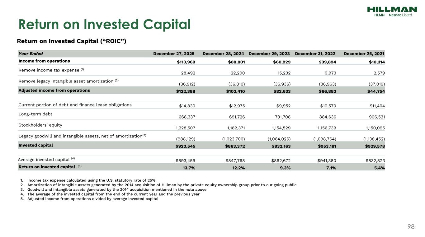#26673F #102F93 #279A56 #4EA72E#239FFF #0E2841 #279A56 #4EA72E Return on Invested Capital 98 text Return on Invested Capital (“ROIC”) 1. Income tax expense calculated using the U.S. statutory rate of 25% 2. Amortization of intangible assets generated by the 2014 acquisition of Hillman by the private equity ownership group prior to our going public 3. Goodwill and intangible assets generated by the 2014 acquisition mentioned in the note above 4. The average of the invested capital from the end of the current year and the previous year 5. Adjusted income from operations divided by average invested capital Year Ended December 27, 2025 December 28, 2024 December 29, 2023 December 31, 2022 December 25, 2021 Income from operations $113,969 $88,801 $60,929 $39,894 $10,314 Remove income tax expense (1) 28,492 22,200 15,232 9,973 2,579 Remove legacy intangible asset amortization (2) (36,912) (36,810) (36,936) (36,963) (37,019) Adjusted income from operations $122,388 $103,410 $82,633 $66,883 $44,754 Current portion of debt and finance lease obligations $14,830 $12,975 $9,952 $10,570 $11,404 Long-term debt 668,337 691,726 731,708 884,636 906,531 Stockholders’ equity 1,228,507 1,182,371 1,154,529 1,156,739 1,150,095 Legacy goodwill and intangible assets, net of amortization(3) (988,129) (1,023,700) (1,064,026) (1,098,764) (1,138,452) Invested capital $923,545 $863,372 $832,163 $953,181 $929,578 Average invested capital (4) $893,459 $847,768 $892,672 $941,380 $832,823 Return on invested capital (5) 13.7% 12.2% 9.3% 7.1% 5.4%