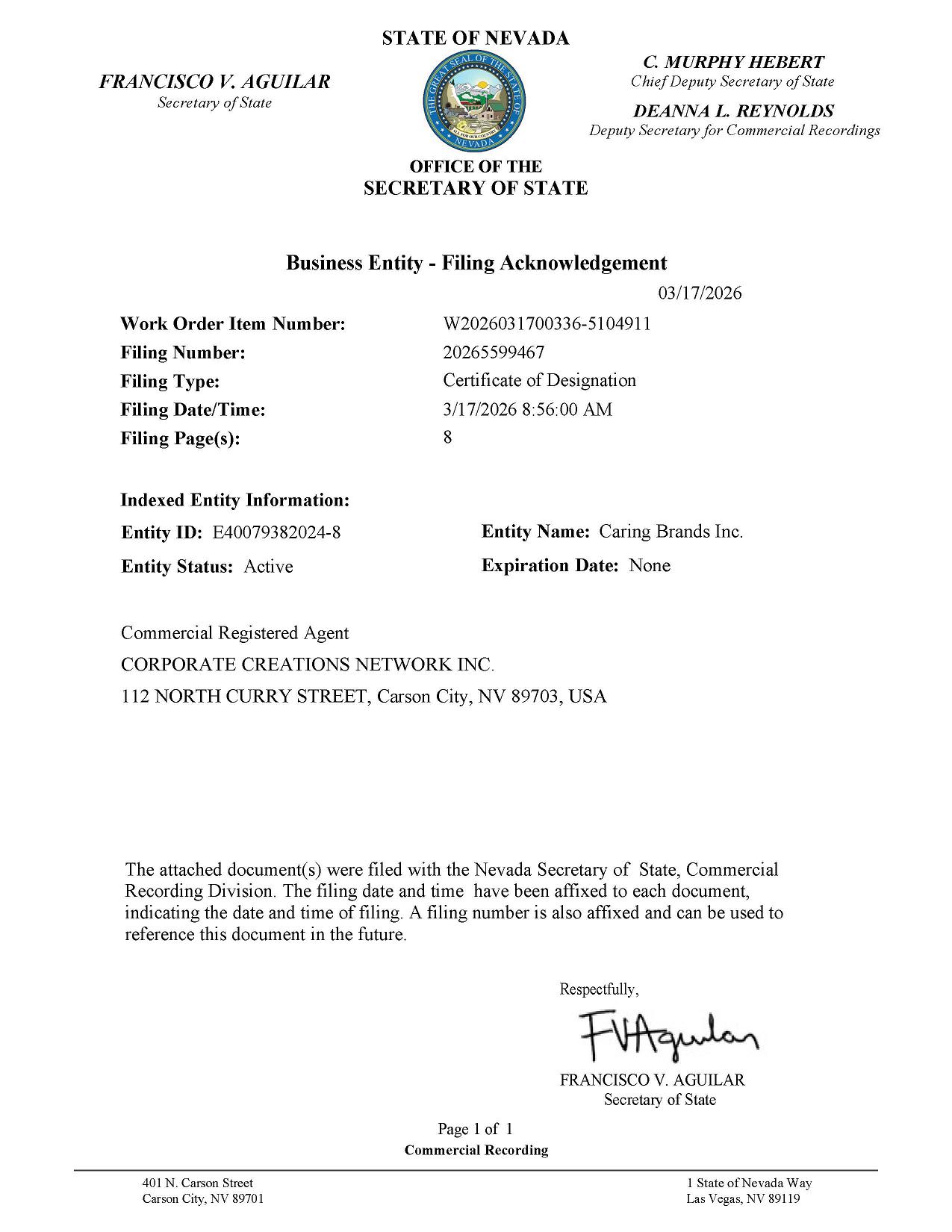 | Caring Brands, Inc., a Nevada corporation | ||