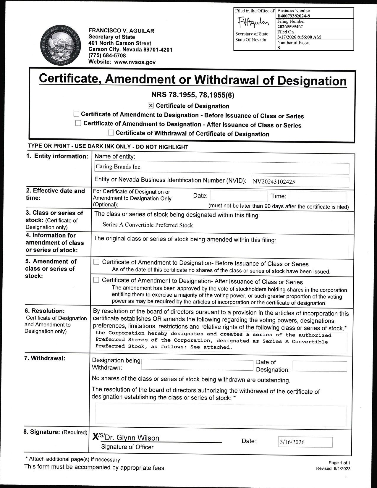 Caring Brands, Inc., a Nevada corporation (the “Corporation”), does hereby certify that, pursuant to the authority contained in its Articles of Incorporation (“Articles”), as amended, and in accordance with the provisions of Section 78.1955 of the Nevada Revised Statutes (the “NRS”), the Corporation’s Board of Directors has duly adopted the following resolutions creating a series of Preferred Stock designated as Series A Convertible Preferred Stock: