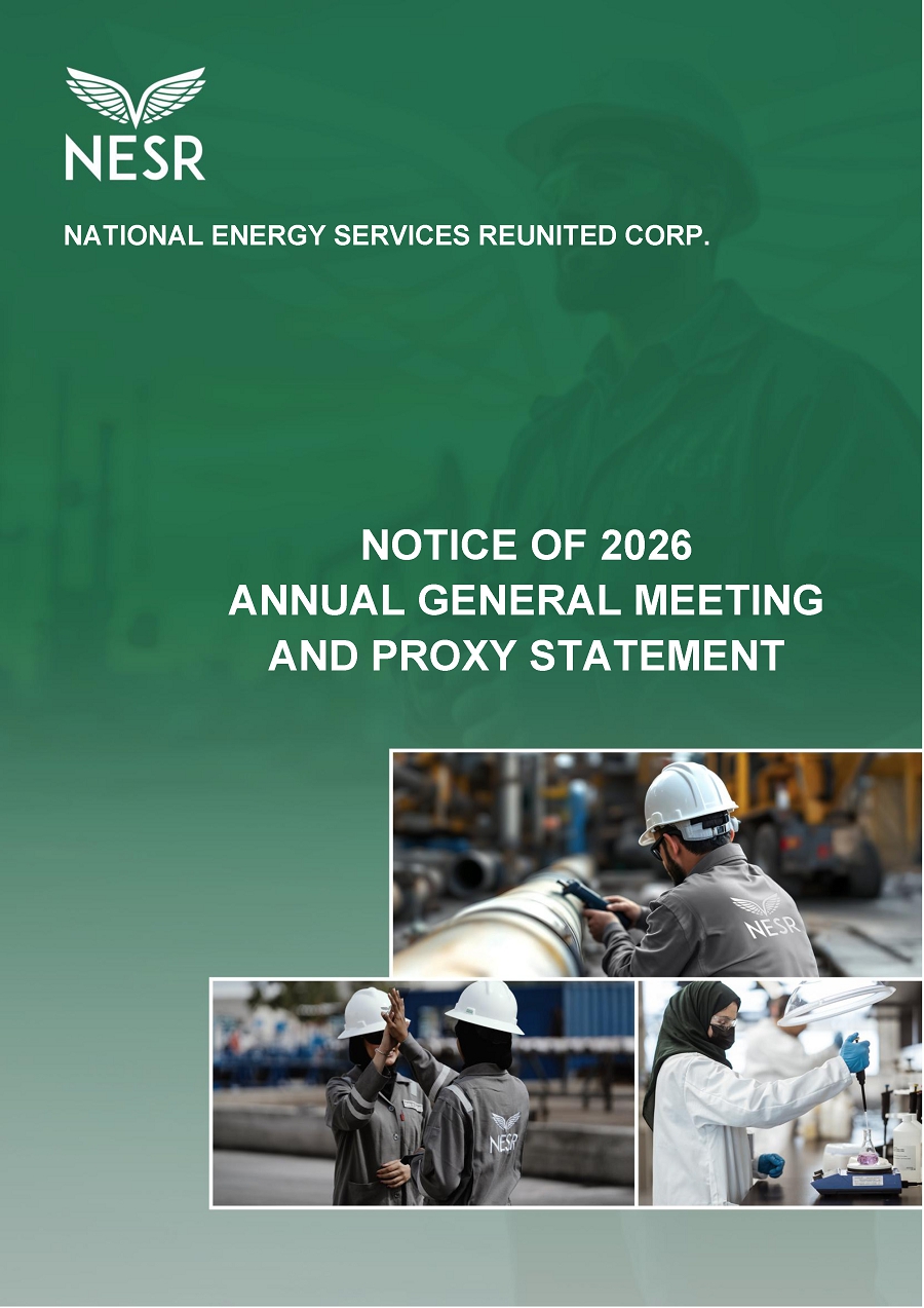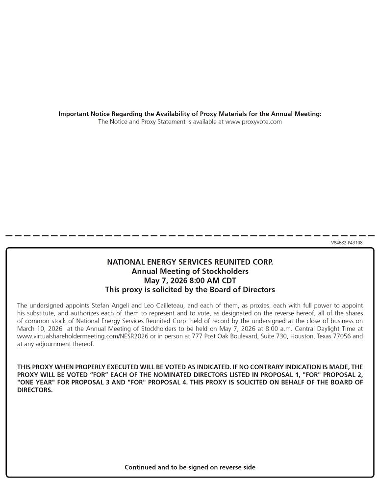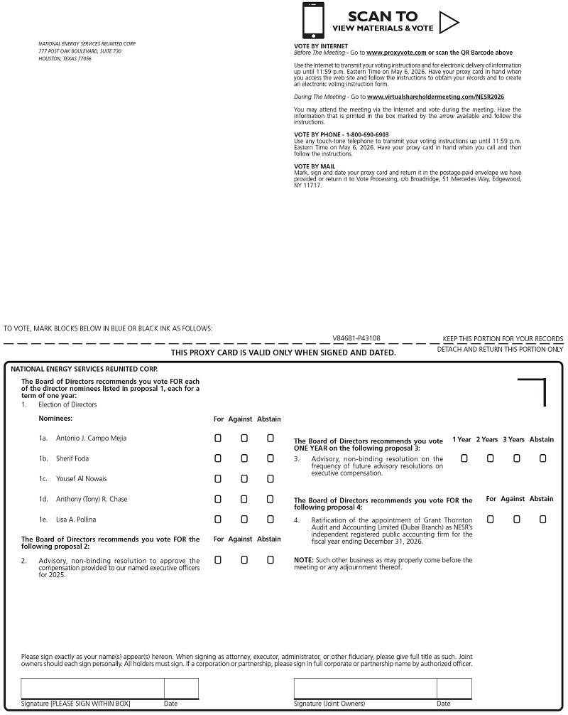 On behalf of the Board of Directors (the “Board”) of National Energy Services Reunited Corp. (the “Company,” “NESR,” “our” or “we”), it is my pleasure to extend to you an invitation to attend the Company’s 2026 annual general meeting of shareholders (the “Annual General Meeting”). The Annual General Meeting will be held at: