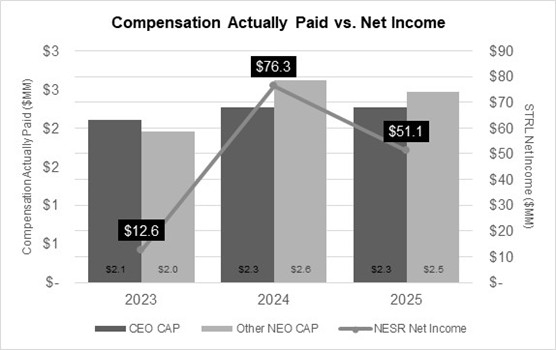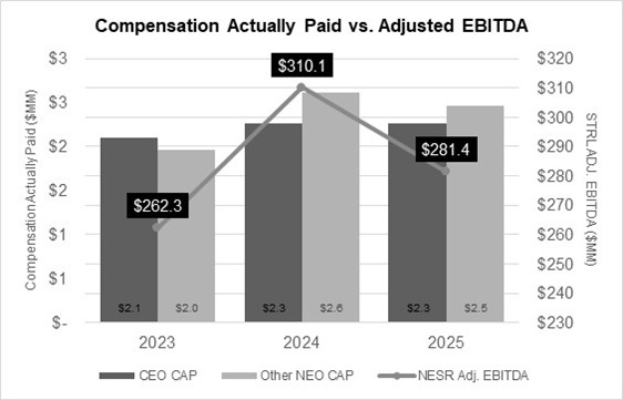 The charts below illustrate the compensation actually paid (“CAP”) to our CEO and other NEOs over the three-year period ended December 31, 2025, in comparison to our net income, adjusted EBITDA, TSR, and the TSR of our peer group. The increase in CAP from 2023 to 2025 was driven primarily by the Company’s share price appreciation of 126% over the period from January 1, 2023, through December 31, 2025. As reflected in the charts, the Company delivered exceptional TSR performance relative to the OSX and achieved meaningful growth in net income and adjusted EBITDA during this period.