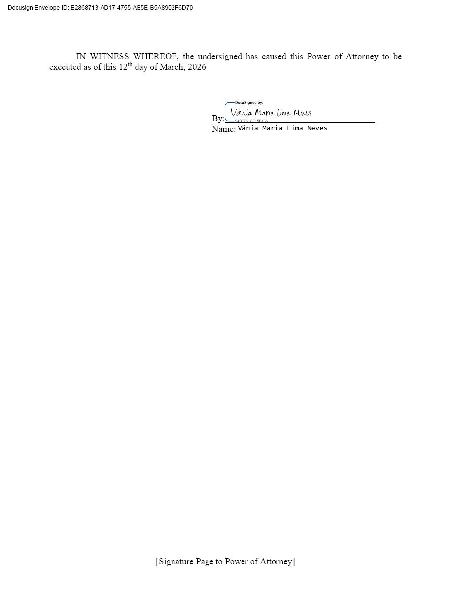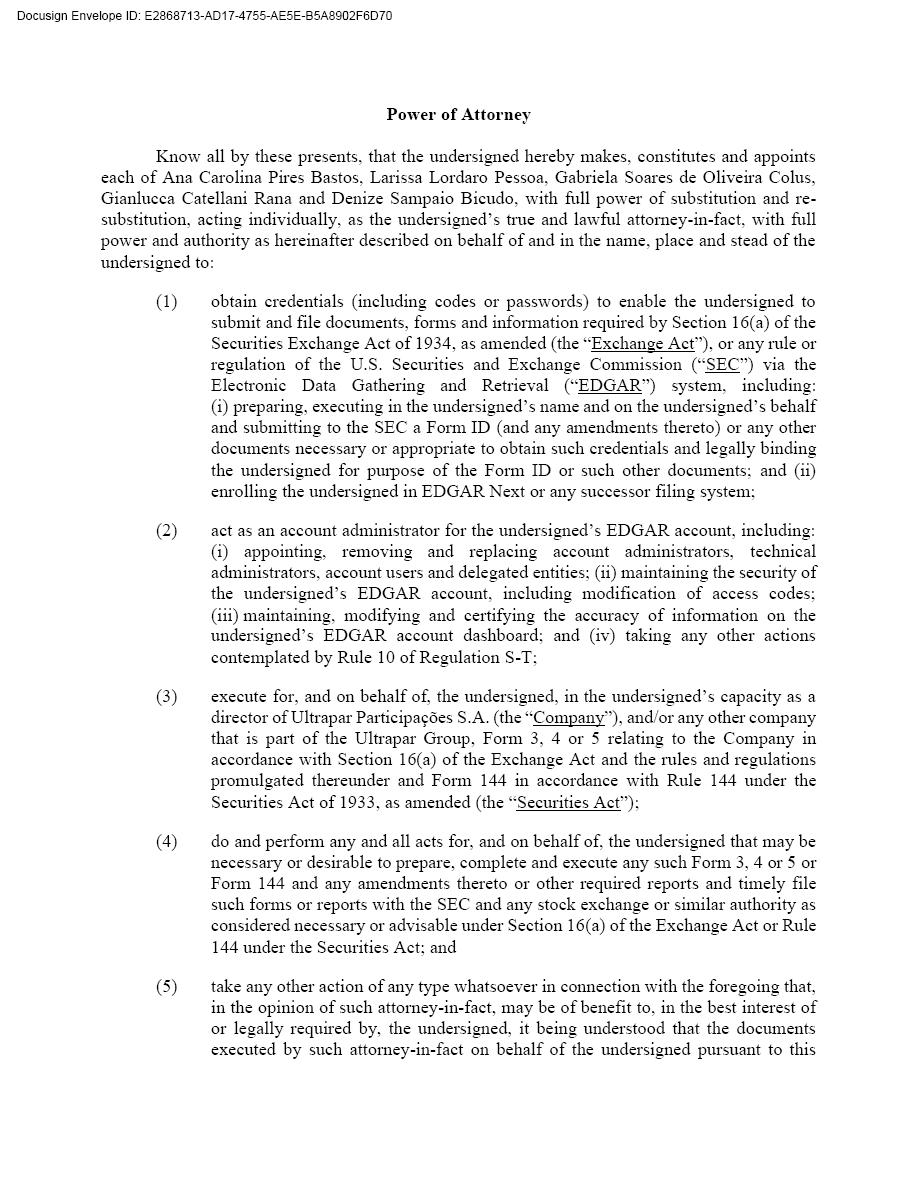Power of Attorney Know all by these presents, that the undersigned hereby makes, constitutes and appoints each of Ana Carolina Pires Bastos, Larissa Lordaro Pessoa, Gabriela Soares de Oliveira Colus, Gianlucca Catellani Rana and Denize Sampaio Bicudo, with full power of substitution and re-substitution, acting individually, as the undersigned’s true and lawful attorney-in-fact, with full power and authority as hereinafter described on behalf of and in the name, place and stead of the undersigned to: (1) obtain credentials (including codes or passwords) to enable the undersigned to submit and file documents, forms and information required by Section 16(a) of the Securities Exchange Act of 1934, as amended (the “Exchange Act”), or any rule or regulation of the U.S. Securities and Exchange Commission (“SEC”) via the Electronic Data Gathering and Retrieval (“EDGAR”) system, including: (i) preparing, executing in the undersigned’s name and on the undersigned’s behalf and submitting to the SEC a Form ID (and any amendments thereto) or any other documents necessary or appropriate to obtain such credentials and legally binding the undersigned for purpose of the Form ID or such other documents; and (ii) enrolling the undersigned in EDGAR Next or any successor filing system; (2) act as an account administrator for the undersigned’s EDGAR account, including: (i) appointing, removing and replacing account administrators, technical administrators, account users and delegated entities; (ii) maintaining the security of the undersigned’s EDGAR account, including modification of access codes; (iii) maintaining, modifying and certifying the accuracy of information on the undersigned’s EDGAR account dashboard; and (iv) taking any other actions contemplated by Rule 10 of Regulation S-T; (3) execute for, and on behalf of, the undersigned, in the undersigned’s capacity as a director of Ultrapar Participações S.A. (the “Company”), and/or any other company that is part of the Ultrapar Group, Form 3, 4 or 5 relating to the Company in accordance with Section 16(a) of the Exchange Act and the rules and regulations promulgated thereunder and Form 144 in accordance with Rule 144 under the Securities Act of 1933, as amended (the “Securities Act”); (4) do and perform any and all acts for, and on behalf of, the undersigned that may be necessary or desirable to prepare, complete and execute any such Form 3, 4 or 5 or Form 144 and any amendments thereto or other required reports and timely file such forms or reports with the SEC and any stock exchange or similar authority as considered necessary or advisable under Section 16(a) of the Exchange Act or Rule 144 under the Securities Act; and (5) take any other action of any type whatsoever in connection with the foregoing that, in the opinion of such attorney-in-fact, may be of benefit to, in the best interest of or legally required by, the undersigned, it being understood that the documents executed by such attorney-in-fact on behalf of the undersigned pursuant to this Docusign Envelope ID: E2868713-AD17-4755-AE5E-B5A8902F6D70 2 Power of Attorney shall be in such form and shall contain such terms and conditions as such attorney-in-fact may approve in such attorney-in-fact’s sole discretion. The undersigned hereby acknowledges that: (i) the foregoing attorneys-in-fact are serving in such capacity at the request of the undersigned; (ii) this Power of Attorney authorizes, but does not require, each such attorney-in-fact to act in his or her discretion on information provided to such attorney-in-fact without independent verification of such information; (iii) any documents prepared and/or executed by any attorney-in-fact on behalf of the undersigned pursuant to this Power of Attorney shall be in such form and shall contain such information and disclosure as such attorney-in-fact, in his or her sole discretion, deems necessary or advisable; (iv) neither the Company nor any attorney-in-fact assumes (a) any liability for the undersigned’s responsibility to comply with the requirements of the Exchange Act or the Securities Act, (b) any liability of the undersigned for any failure to comply with such requirements or (c) any obligation or liability of the undersigned for profit disgorgement under Section 16(b) of the Exchange Act; and (v) this Power of Attorney does not relieve the undersigned from responsibility for compliance with the undersigned’s obligations under the Exchange Act or the Securities Act, including, without limitation, the reporting requirements under Section 16(a) of the Exchange Act. This Power of Attorney shall remain in full force and effect until the undersigned is no longer required to file Forms 3, 4 and 5 or Form 144 with respect to the undersigned’s holdings of, and transactions in, securities issued by the Company, unless earlier revoked as to any attorney-in-fact by the undersigned in a signed writing delivered to such attorney-in-fact. [Signature Page Follows] Docusign Envelope ID: E2868713-AD17-4755-AE5E-B5A8902F6D70 [Signature Page to Power of Attorney] IN WITNESS WHEREOF, the undersigned has caused this Power of Attorney to be executed as of this 12th day of March, 2026. By: Name: Docusign Envelope ID: E2868713-AD17-4755-AE5E-B5A8902F6D70 Vânia Maria Lima Neves