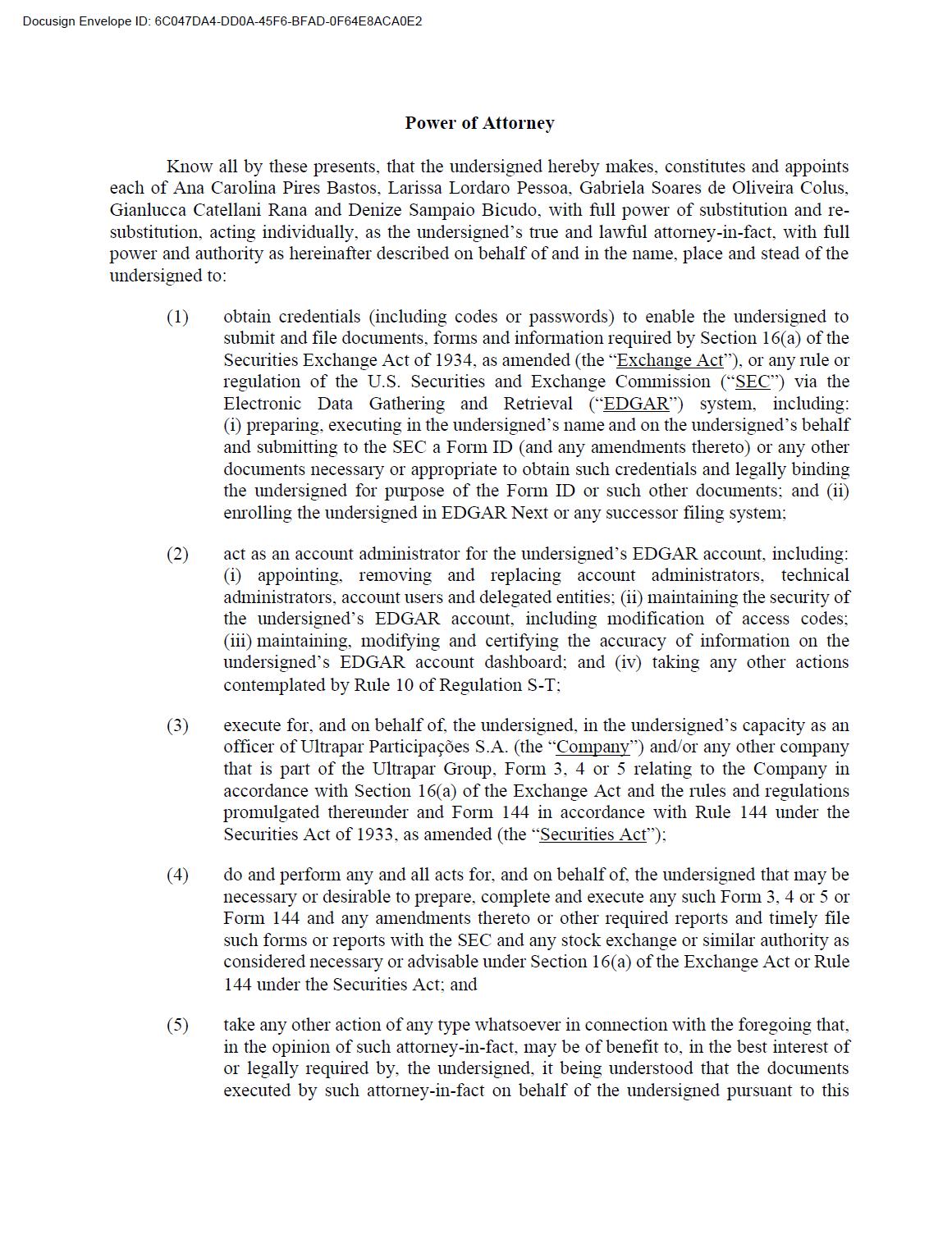 Power of Attorney Know all by these presents, that the undersigned hereby makes, constitutes and appoints each of Ana Carolina Pires Bastos, Larissa Lordaro Pessoa, Gabriela Soares de Oliveira Colus, Gianlucca Catellani Rana and Denize Sampaio Bicudo, with full power of substitution and re-substitution, acting individually, as the undersigned’s true and lawful attorney-in-fact, with full power and authority as hereinafter described on behalf of and in the name, place and stead of the undersigned to: (1) obtain credentials (including codes or passwords) to enable the undersigned to submit and file documents, forms and information required by Section 16(a) of the Securities Exchange Act of 1934, as amended (the “Exchange Act”), or any rule or regulation of the U.S. Securities and Exchange Commission (“SEC”) via the Electronic Data Gathering and Retrieval (“EDGAR”) system, including: (i) preparing, executing in the undersigned’s name and on the undersigned’s behalf and submitting to the SEC a Form ID (and any amendments thereto) or any other documents necessary or appropriate to obtain such credentials and legally binding the undersigned for purpose of the Form ID or such other documents; and (ii) enrolling the undersigned in EDGAR Next or any successor filing system; (2) act as an account administrator for the undersigned’s EDGAR account, including: (i) appointing, removing and replacing account administrators, technical administrators, account users and delegated entities; (ii) maintaining the security of the undersigned’s EDGAR account, including modification of access codes; (iii) maintaining, modifying and certifying the accuracy of information on the undersigned’s EDGAR account dashboard; and (iv) taking any other actions contemplated by Rule 10 of Regulation S-T; (3) execute for, and on behalf of, the undersigned, in the undersigned’s capacity as an officer of Ultrapar Participações S.A. (the “Company”) and/or any other company that is part of the Ultrapar Group, Form 3, 4 or 5 relating to the Company in accordance with Section 16(a) of the Exchange Act and the rules and regulations promulgated thereunder and Form 144 in accordance with Rule 144 under the Securities Act of 1933, as amended (the “Securities Act”); (4) do and perform any and all acts for, and on behalf of, the undersigned that may be necessary or desirable to prepare, complete and execute any such Form 3, 4 or 5 or Form 144 and any amendments thereto or other required reports and timely file such forms or reports with the SEC and any stock exchange or similar authority as considered necessary or advisable under Section 16(a) of the Exchange Act or Rule 144 under the Securities Act; and (5) take any other action of any type whatsoever in connection with the foregoing that, in the opinion of such attorney-in-fact, may be of benefit to, in the best interest of or legally required by, the undersigned, it being understood that the documents executed by such attorney-in-fact on behalf of the undersigned pursuant to this Docusign Envelope ID: 6C047DA4-DD0A-45F6-BFAD-0F64E8ACA0E2 2 Power of Attorney shall be in such form and shall contain such terms and conditions as such attorney-in-fact may approve in such attorney-in-fact’s sole discretion. The undersigned hereby acknowledges that: (i) the foregoing attorneys-in-fact are serving in such capacity at the request of the undersigned; (ii) this Power of Attorney authorizes, but does not require, each such attorney-in-fact to act in his or her discretion on information provided to such attorney-in-fact without independent verification of such information; (iii) any documents prepared and/or executed by any attorney-in-fact on behalf of the undersigned pursuant to this Power of Attorney shall be in such form and shall contain such information and disclosure as such attorney-in-fact, in his or her sole discretion, deems necessary or advisable; (iv) neither the Company nor any attorney-in-fact assumes (a) any liability for the undersigned’s responsibility to comply with the requirements of the Exchange Act or the Securities Act, (b) any liability of the undersigned for any failure to comply with such requirements or (c) any obligation or liability of the undersigned for profit disgorgement under Section 16(b) of the Exchange Act; and (v) this Power of Attorney does not relieve the undersigned from responsibility for compliance with the undersigned’s obligations under the Exchange Act or the Securities Act, including, without limitation, the reporting requirements under Section 16(a) of the Exchange Act. This Power of Attorney shall remain in full force and effect until the undersigned is no longer required to file Forms 3, 4 and 5 or Form 144 with respect to the undersigned’s holdings of, and transactions in, securities issued by the Company, unless earlier revoked as to any attorney-in-fact by the undersigned in a signed writing delivered to such attorney-in-fact. [Signature Page Follows] Docusign Envelope ID: 6C047DA4-DD0A-45F6-BFAD-0F64E8ACA0E2 [Signature Page to Power of Attorney] IN WITNESS WHEREOF, the undersigned has caused this Power of Attorney to be executed as of this 12th day of March, 2026. By: Name: Docusign Envelope ID: 6C047DA4-DD0A-45F6-BFAD-0F64E8ACA0E2 Décio Amaral