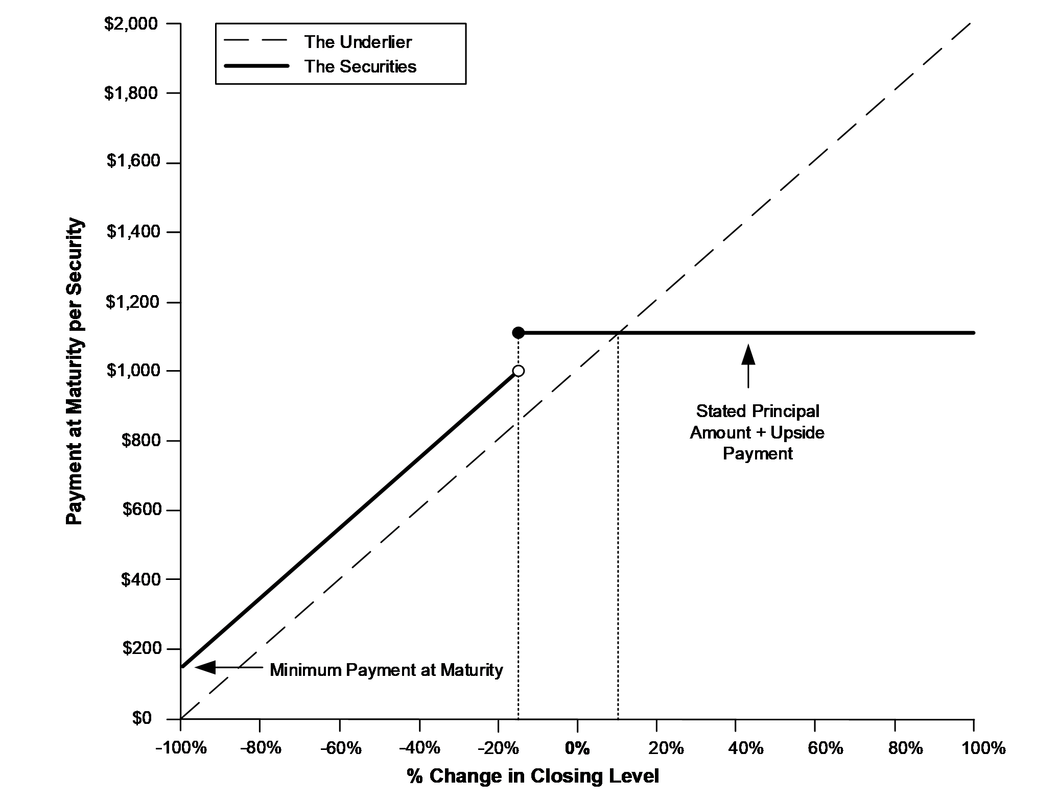 ■Payment at maturity. At maturity, if the final level is greater than or equal to the buffer level, investors will receive the stated principal amount plus the upside payment specified herein. If, however, the final level is less than the buffer level, investors will lose 1% for every 1% decline in the level of the underlier beyond the specified buffer amount. Under these circumstances, the payment at maturity will be less, and may be significantly less, than the stated principal amount of the securities, subject to the minimum payment at maturity.