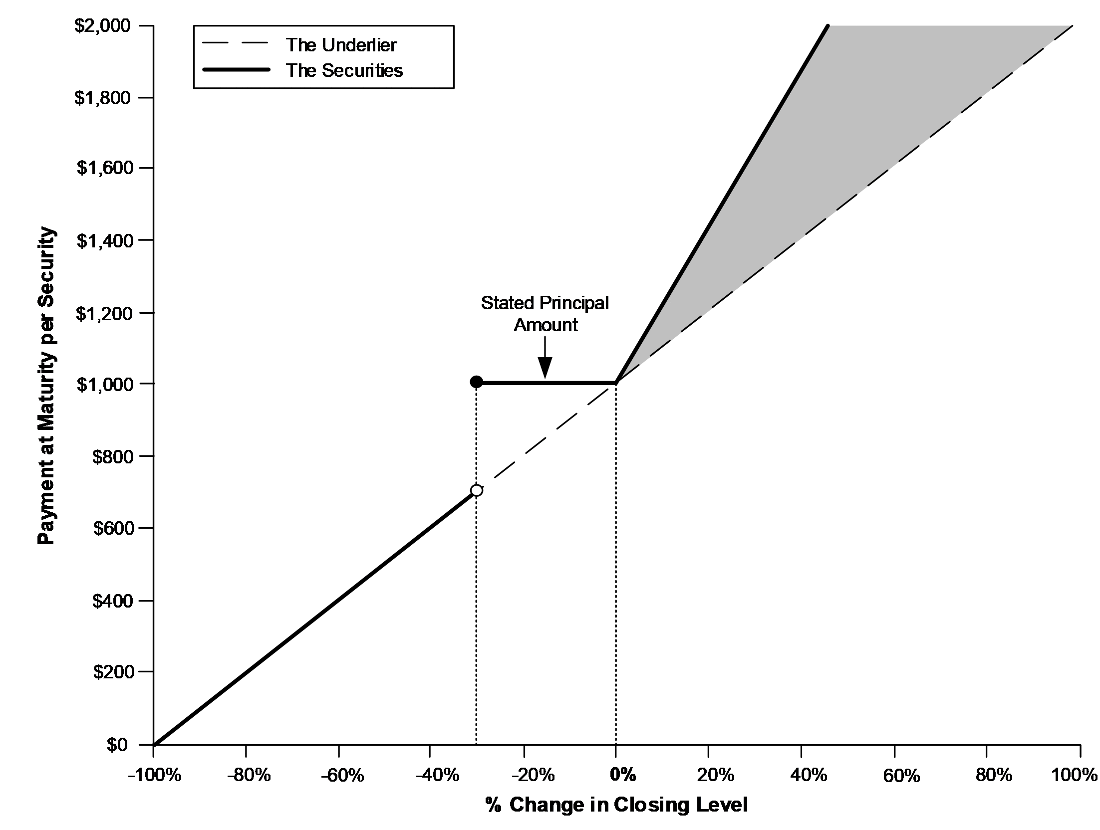 ■Payment at maturity. At maturity, if the final level is greater than the initial level, investors will receive the stated principal amount plus the leveraged upside payment. If the final level is equal to or less than the initial level but is greater than or equal to the downside threshold level, investors will receive only the stated principal amount at maturity. If, however, the final level is less than the downside threshold level, investors will lose 1% for every 1% decline in the level of the underlier over the term of the securities. Under these circumstances, the payment at maturity will be significantly less than the stated principal amount and could be zero.