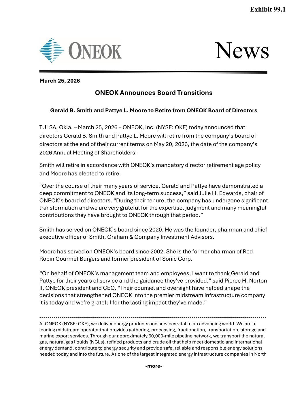 -more- News ONEOK Announces Board Transitions Gerald B. Smith and Pattye L. Moore to Retire from ONEOK Board of Directors TULSA, Okla. – March 25, 2026 – ONEOK, Inc. (NYSE: OKE) today announced that directors Gerald B. Smith and Pattye L. Moore will retire from the company’s board of directors at the end of their current terms on May 20, 2026, the date of the company’s 2026 Annual Meeting of Shareholders. Smith will retire in accordance with ONEOK’s mandatory director retirement age policy and Moore has elected to retire. “Over the course of their many years of service, Gerald and Pattye have demonstrated a deep commitment to ONEOK and its long-term success,” said Julie H. Edwards, chair of ONEOK’s board of directors. “During their tenure, the company has undergone significant transformation and we are very grateful for the expertise, judgment and many meaningful contributions they have brought to ONEOK through that period.” Smith has served on ONEOK’s board since 2020. He was the founder, chairman and chief executive officer of Smith, Graham & Company Investment Advisors. Moore has served on ONEOK’s board since 2002. She is the former chairman of Red Robin Gourmet Burgers and former president of Sonic Corp. “On behalf of ONEOK’s management team and employees, I want to thank Gerald and Pattye for their years of service and the guidance they’ve provided,” said Pierce H. Norton II, ONEOK president and CEO. “Their counsel and oversight have helped shape the decisions that strengthened ONEOK into the premier midstream infrastructure company it is today and we’re grateful for the lasting impact they’ve made.” ---------------------------------------------------------------------------------------------------------------- At ONEOK (NYSE: OKE), we deliver energy products and services vital to an advancing world. We are a leading midstream operator that provides gathering, processing, fractionation, transportation, storage and marine export services. Through our approximately 60,000-mile pipeline network, we transport the natural gas, natural gas liquids (NGLs), refined products and crude oil that help meet domestic and international energy demand, contribute to energy security and provide safe, reliable and responsible energy solutions needed today and into the future. As one of the largest integrated energy infrastructure companies in North March 25, 2026 Exhibit 99.1