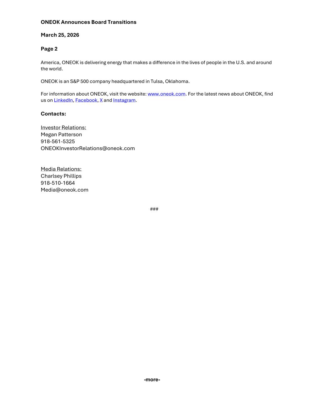 ONEOK Announces Board Transitions March 25, 2026 Page 2 -more- America, ONEOK is delivering energy that makes a difference in the lives of people in the U.S. and around the world. ONEOK is an S&P 500 company headquartered in Tulsa, Oklahoma. For information about ONEOK, visit the website: www.oneok.com. For the latest news about ONEOK, find us on LinkedIn, Facebook, X and Instagram. Contacts: Investor Relations: Megan Patterson 918-561-5325 ONEOKInvestorRelations@oneok.com Media Relations: Charlsey Phillips 918-510-1664 Media@oneok.com ###