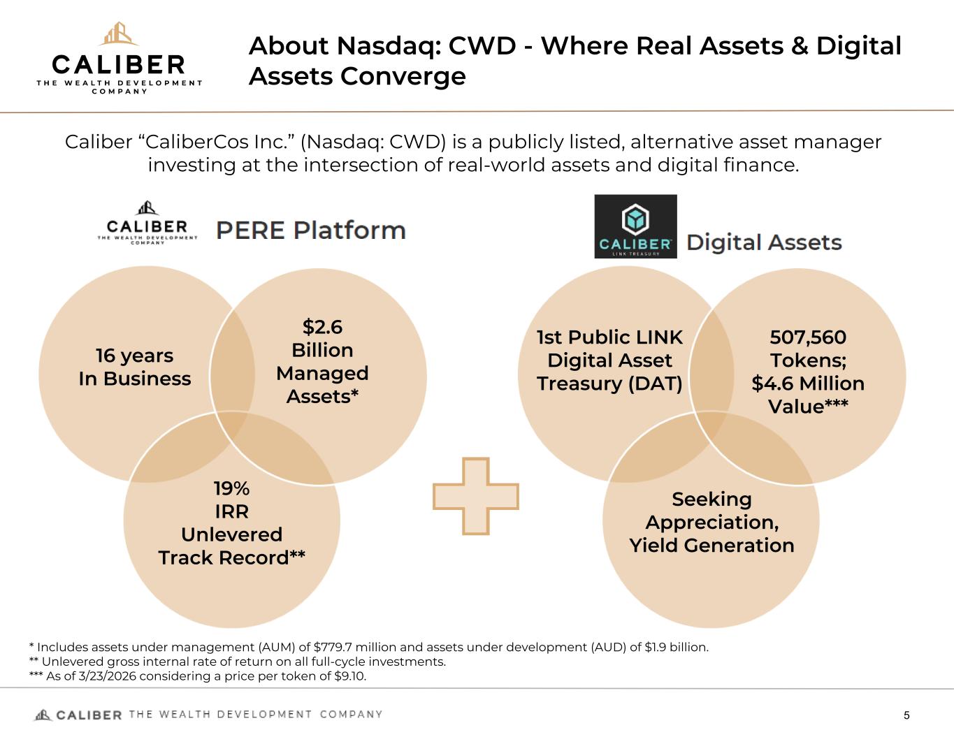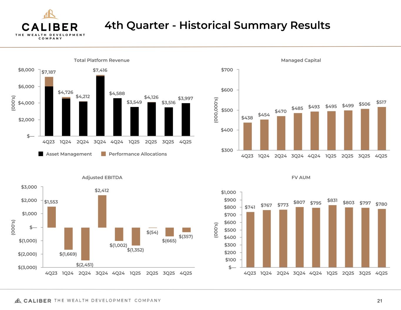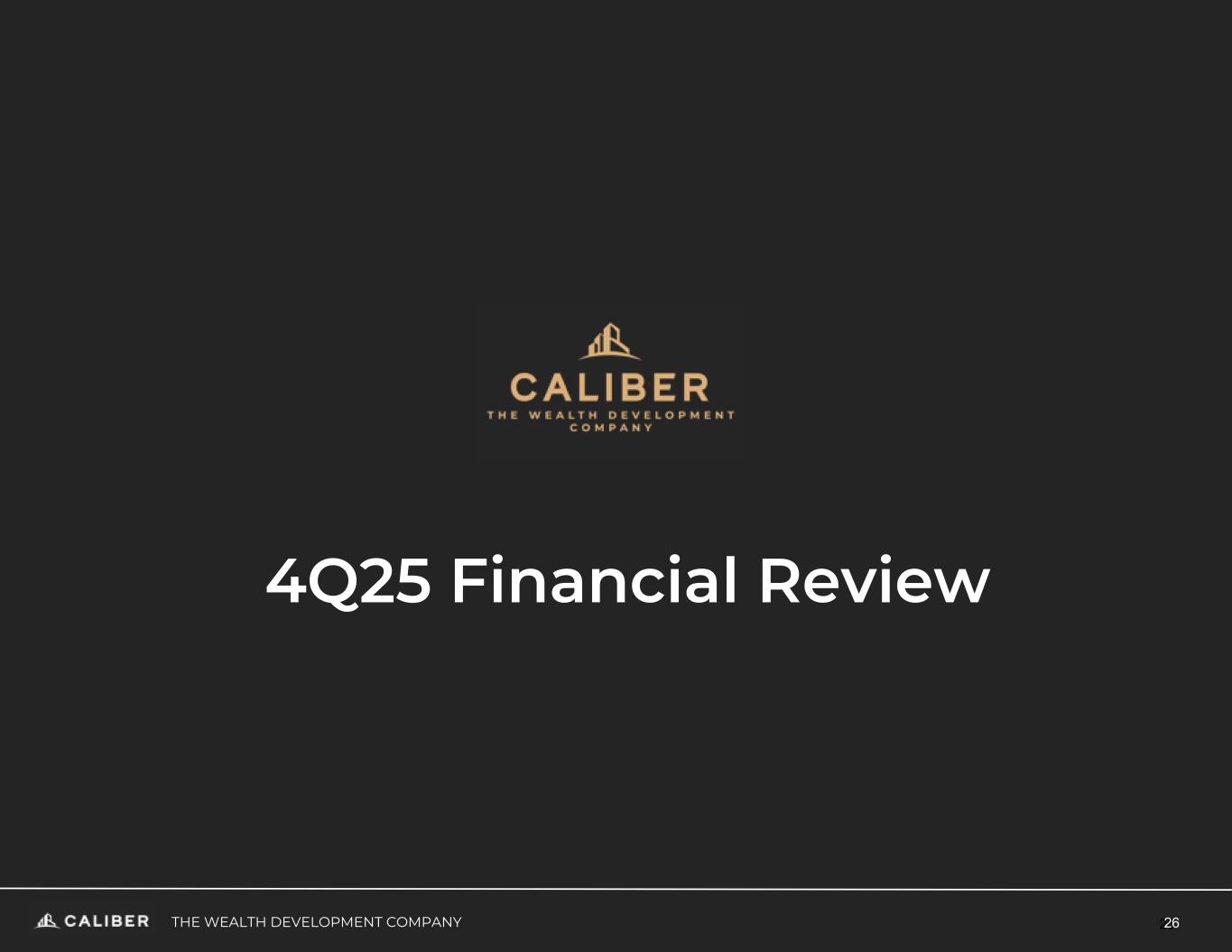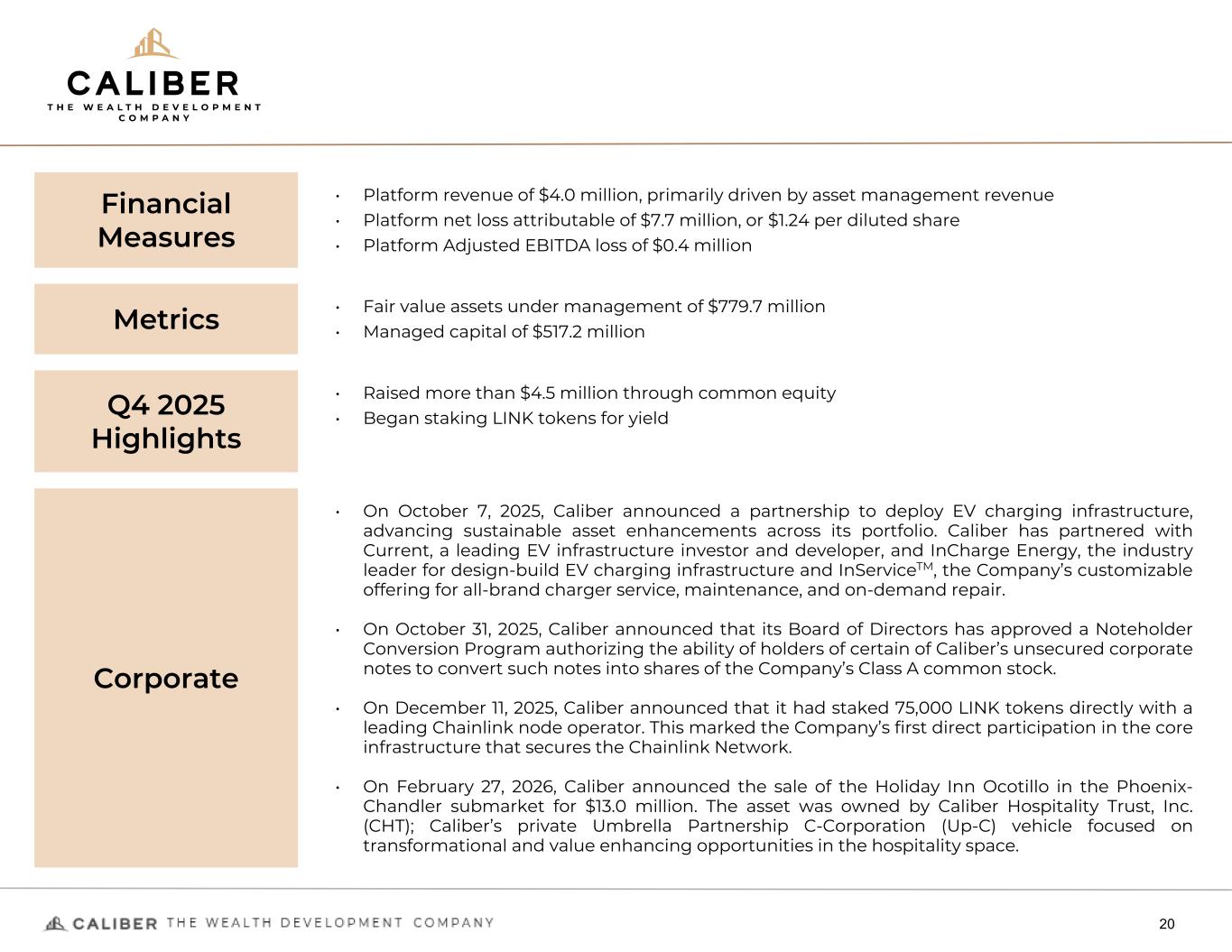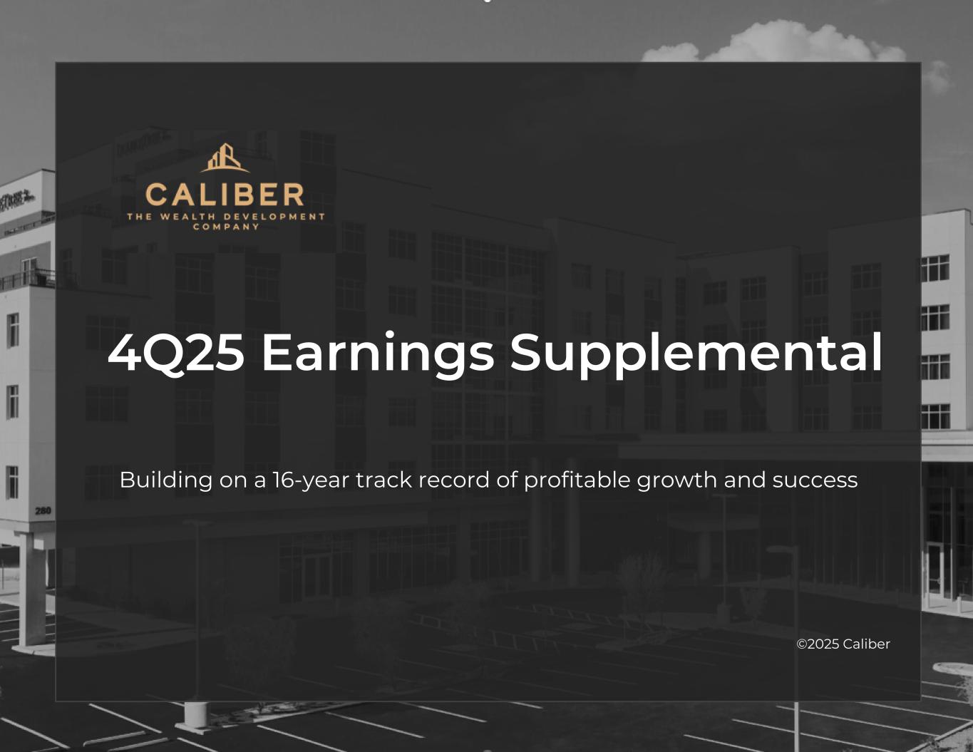 4Q25 - Summary Highlights 20 Financial Measures • Platform revenue of $4.0 million, primarily driven by asset management revenue • Platform net loss attributable of $7.7 million, or $1.24 per diluted share • Platform Adjusted EBITDA loss of $0.4 million Metrics • Fair value assets under management of $779.7 million • Managed capital of $517.2 million Q4 2025 Highlights • Raised more than $4.5 million through common equity • Began staking LINK tokens for yield Corporate • On October 7, 2025, Caliber announced a partnership to deploy EV charging infrastructure, advancing sustainable asset enhancements across its portfolio. Caliber has partnered with Current, a leading EV infrastructure investor and developer, and InCharge Energy, the industry leader for design-build EV charging infrastructure and InServiceTM, the Company’s customizable offering for all-brand charger service, maintenance, and on-demand repair. • On October 31, 2025, Caliber announced that its Board of Directors has approved a Noteholder Conversion Program authorizing the ability of holders of certain of Caliber’s unsecured corporate notes to convert such notes into shares of the Company’s Class A common stock. • On December 11, 2025, Caliber announced that it had staked 75,000 LINK tokens directly with a leading Chainlink node operator. This marked the Company’s first direct participation in the core infrastructure that secures the Chainlink Network. • On February 27, 2026, Caliber announced the sale of the Holiday Inn Ocotillo in the Phoenix- Chandler submarket for $13.0 million. The asset was owned by Caliber Hospitality Trust, Inc. (CHT); Caliber’s private Umbrella Partnership C-Corporation (Up-C) vehicle focused on transformational and value enhancing opportunities in the hospitality space.