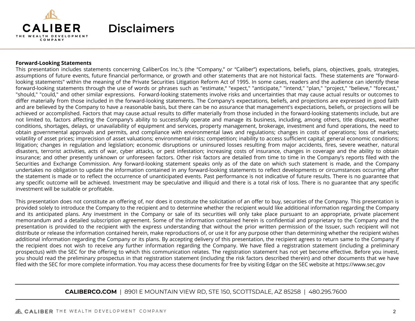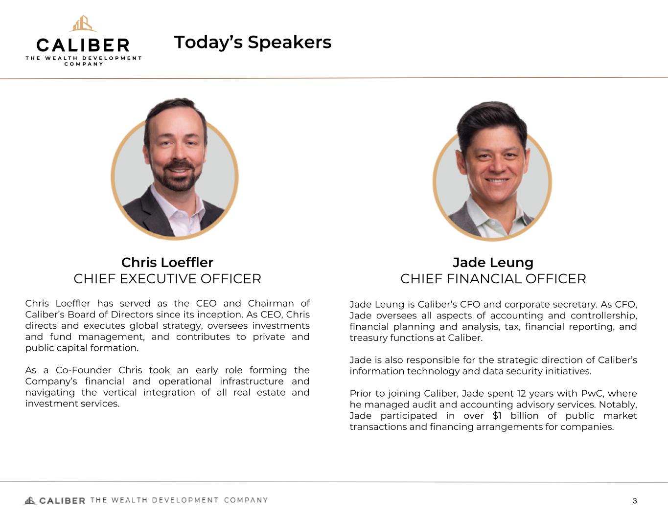 Disclaimers Forward-Looking Statements This presentation includes statements concerning CaliberCos Inc.’s (the “Company,” or “Caliber”) expectations, beliefs, plans, objectives, goals, strategies, assumptions of future events, future financial performance, or growth and other statements that are not historical facts. These statements are "forward- looking statements" within the meaning of the Private Securities Litigation Reform Act of 1995. In some cases, readers and the audience can identify these forward-looking statements through the use of words or phrases such as "estimate,“ "expect," "anticipate," "intend," "plan," "project," "believe," "forecast," "should," "could," and other similar expressions. Forward-looking statements involve risks and uncertainties that may cause actual results or outcomes to differ materially from those included in the forward-looking statements. The Company's expectations, beliefs, and projections are expressed in good faith and are believed by the Company to have a reasonable basis, but there can be no assurance that management's expectations, beliefs, or projections will be achieved or accomplished. Factors that may cause actual results to differ materially from those included in the forward-looking statements include, but are not limited to, factors affecting the Company’s ability to successfully operate and manage its business, including, among others, title disputes, weather conditions, shortages, delays, or unavailability of equipment and services, property management, brokerage, investment and fund operations, the need to obtain governmental approvals and permits, and compliance with environmental laws and regulations; changes in costs of operations; loss of markets; volatility of asset prices; imprecision of asset valuations; environmental risks; competition; inability to access sufficient capital; general economic conditions; litigation; changes in regulation and legislation; economic disruptions or uninsured losses resulting from major accidents, fires, severe weather, natural disasters, terrorist activities, acts of war, cyber attacks, or pest infestation; increasing costs of insurance, changes in coverage and the ability to obtain insurance; and other presently unknown or unforeseen factors. Other risk factors are detailed from time to time in the Company's reports filed with the Securities and Exchange Commission. Any forward-looking statement speaks only as of the date on which such statement is made, and the Company undertakes no obligation to update the information contained in any forward-looking statements to reflect developments or circumstances occurring after the statement is made or to reflect the occurrence of unanticipated events. Past performance is not indicative of future results. There is no guarantee that any specific outcome will be achieved. Investment may be speculative and illiquid and there is a total risk of loss. There is no guarantee that any specific investment will be suitable or profitable. This presentation does not constitute an offering of, nor does it constitute the solicitation of an offer to buy, securities of the Company. This presentation is provided solely to introduce the Company to the recipient and to determine whether the recipient would like additional information regarding the Company and its anticipated plans. Any investment in the Company or sale of its securities will only take place pursuant to an appropriate, private placement memorandum and a detailed subscription agreement. Some of the information contained herein is confidential and proprietary to the Company and the presentation is provided to the recipient with the express understanding that without the prior written permission of the Issuer, such recipient will not distribute or release the information contained herein, make reproductions of, or use it for any purpose other than determining whether the recipient wishes additional information regarding the Company or its plans. By accepting delivery of this presentation, the recipient agrees to return same to the Company if the recipient does not wish to receive any further information regarding the Company. We have filed a registration statement (including a preliminary prospectus) with the SEC for the offering to which this communication relates. The registration statement has not yet become effective. Before you invest, you should read the preliminary prospectus in that registration statement (including the risk factors described therein) and other documents that we have filed with the SEC for more complete information. You may access these documents for free by visiting Edgar on the SEC website at https://www.sec.gov CALIBERCO.COM | 8901 E MOUNTAIN VIEW RD, STE 150, SCOTTSDALE, AZ 85258 | 480.295.7600 2