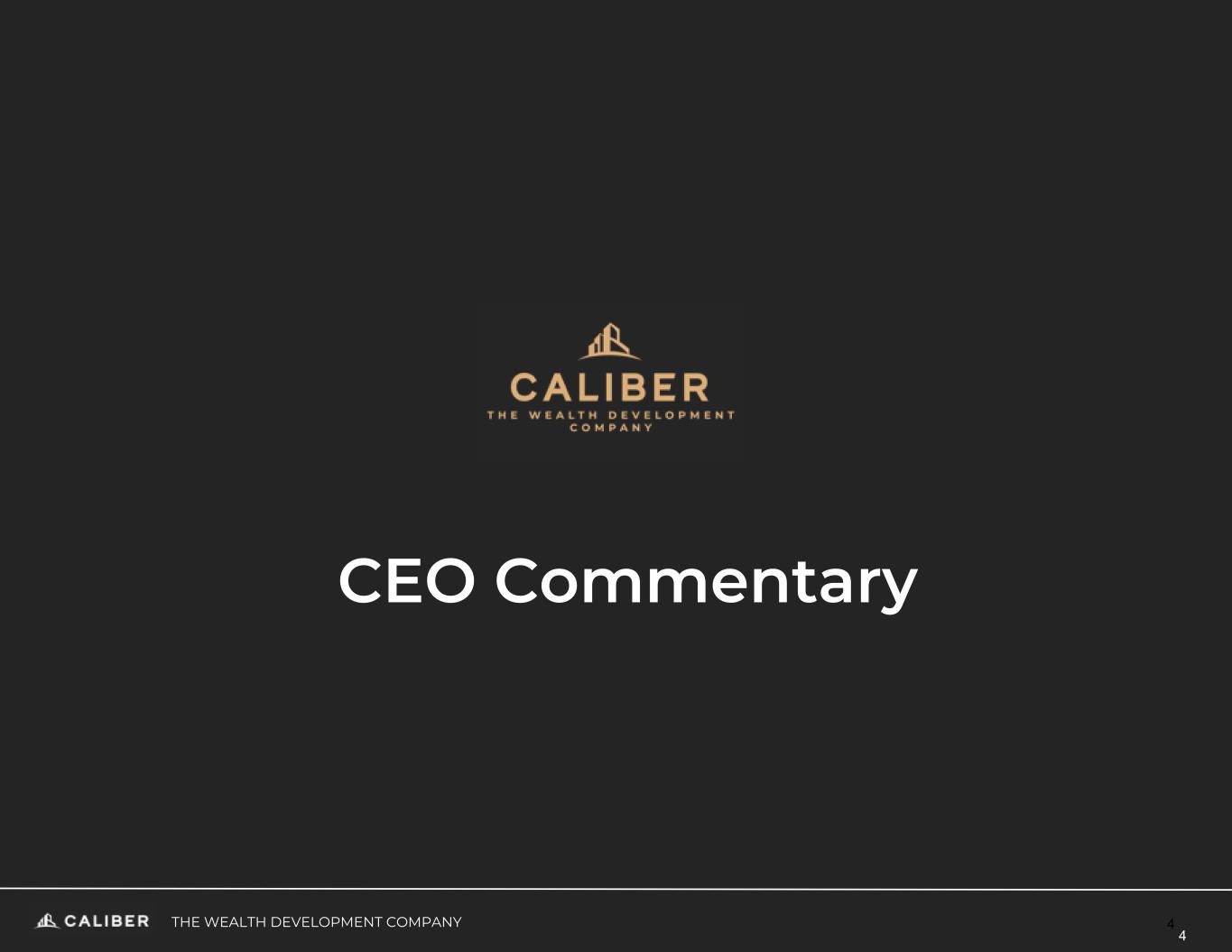 Today’s Speakers Chris Loeffler CHIEF EXECUTIVE OFFICER Chris Loeffler has served as the CEO and Chairman of Caliber’s Board of Directors since its inception. As CEO, Chris directs and executes global strategy, oversees investments and fund management, and contributes to private and public capital formation. As a Co-Founder Chris took an early role forming the Company’s financial and operational infrastructure and navigating the vertical integration of all real estate and investment services. 3 Jade Leung CHIEF FINANCIAL OFFICER Jade Leung is Caliber’s CFO and corporate secretary. As CFO, Jade oversees all aspects of accounting and controllership, financial planning and analysis, tax, financial reporting, and treasury functions at Caliber. Jade is also responsible for the strategic direction of Caliber’s information technology and data security initiatives. Prior to joining Caliber, Jade spent 12 years with PwC, where he managed audit and accounting advisory services. Notably, Jade participated in over $1 billion of public market transactions and financing arrangements for companies.