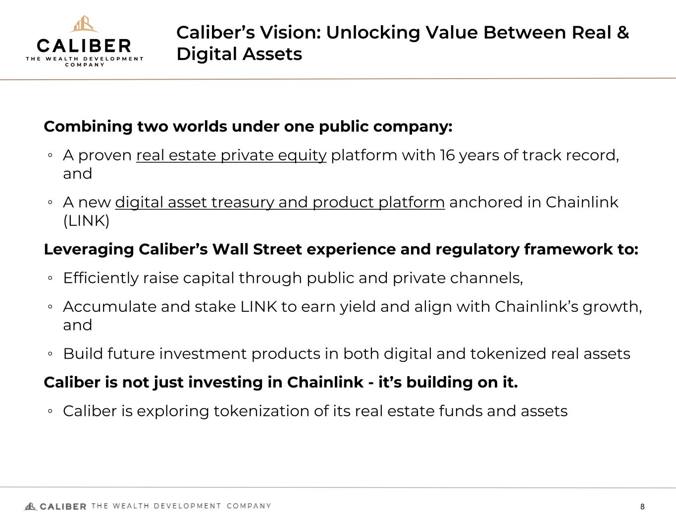 Caliber’s Vision: Unlocking Value Between Real & Digital Assets 8 Combining two worlds under one public company: ◦ A proven real estate private equity platform with 16 years of track record, and ◦ A new digital asset treasury and product platform anchored in Chainlink (LINK) Leveraging Caliber’s Wall Street experience and regulatory framework to: ◦ Efficiently raise capital through public and private channels, ◦ Accumulate and stake LINK to earn yield and align with Chainlink’s growth, and ◦ Build future investment products in both digital and tokenized real assets Caliber is not just investing in Chainlink - it’s building on it. ◦ Caliber is exploring tokenization of its real estate funds and assets