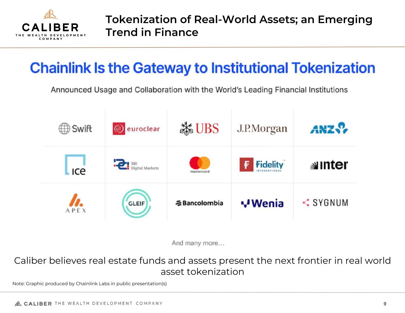 Tokenization of Real-World Assets; an Emerging Trend in Finance 9 Caliber believes real estate funds and assets present the next frontier in real world asset tokenization Note: Graphic produced by Chainlink Labs in public presentation(s)