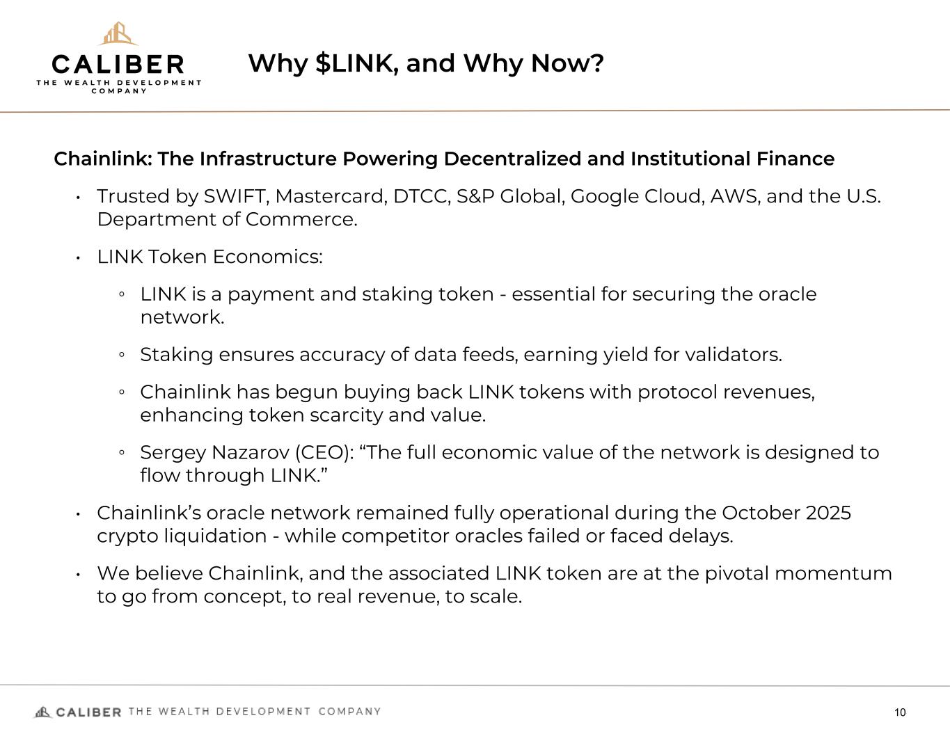 Why $LINK, and Why Now? 10 Chainlink: The Infrastructure Powering Decentralized and Institutional Finance • Trusted by SWIFT, Mastercard, DTCC, S&P Global, Google Cloud, AWS, and the U.S. Department of Commerce. • LINK Token Economics: ◦ LINK is a payment and staking token - essential for securing the oracle network. ◦ Staking ensures accuracy of data feeds, earning yield for validators. ◦ Chainlink has begun buying back LINK tokens with protocol revenues, enhancing token scarcity and value. ◦ Sergey Nazarov (CEO): “The full economic value of the network is designed to flow through LINK.” • Chainlink’s oracle network remained fully operational during the October 2025 crypto liquidation - while competitor oracles failed or faced delays. • We believe Chainlink, and the associated LINK token are at the pivotal momentum to go from concept, to real revenue, to scale.