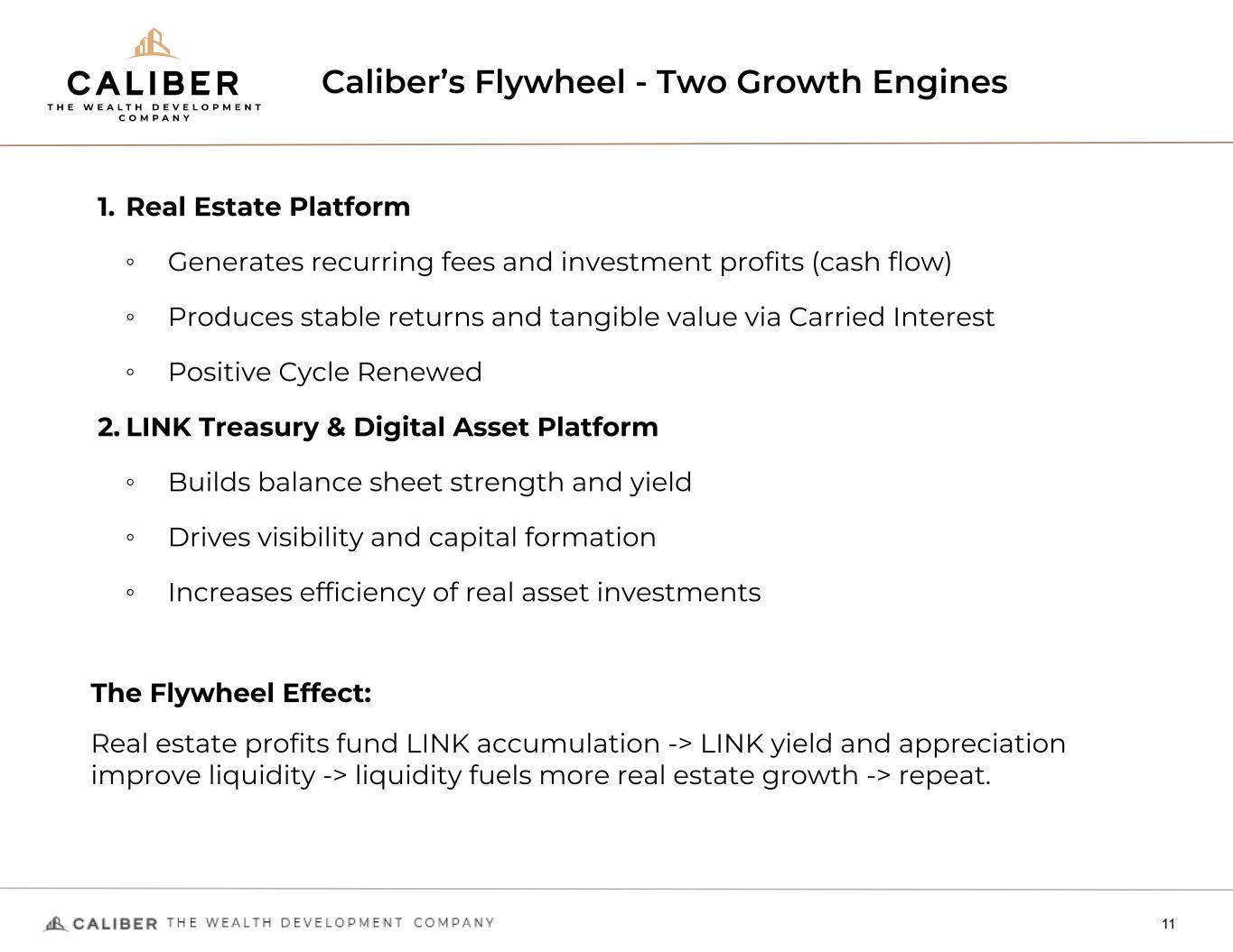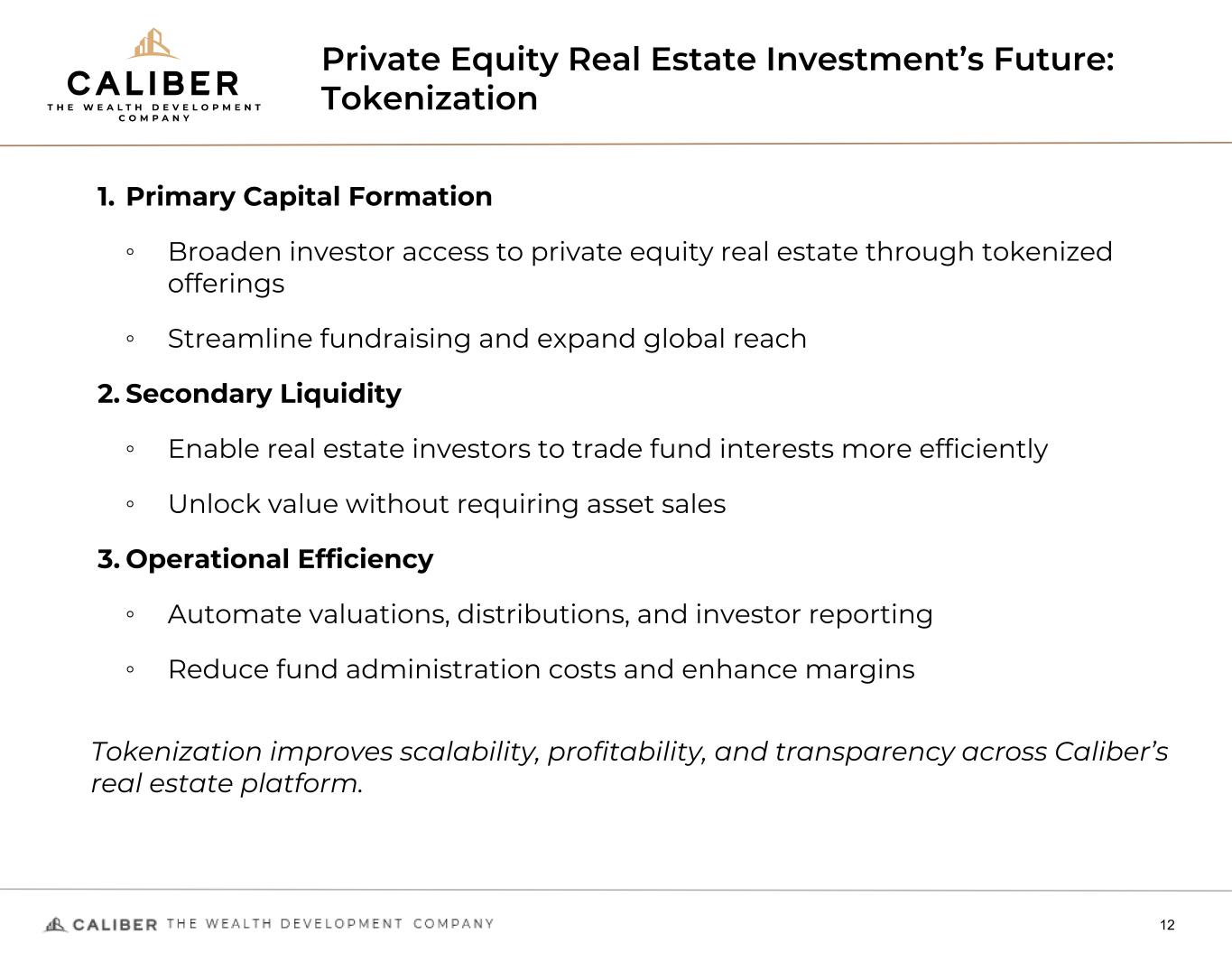 Caliber’s Flywheel - Two Growth Engines 11 1. Real Estate Platform ◦ Generates recurring fees and investment profits (cash flow) ◦ Produces stable returns and tangible value via Carried Interest ◦ Positive Cycle Renewed 2. LINK Treasury & Digital Asset Platform ◦ Builds balance sheet strength and yield ◦ Drives visibility and capital formation ◦ Increases efficiency of real asset investments The Flywheel Effect: Real estate profits fund LINK accumulation -> LINK yield and appreciation improve liquidity -> liquidity fuels more real estate growth -> repeat.