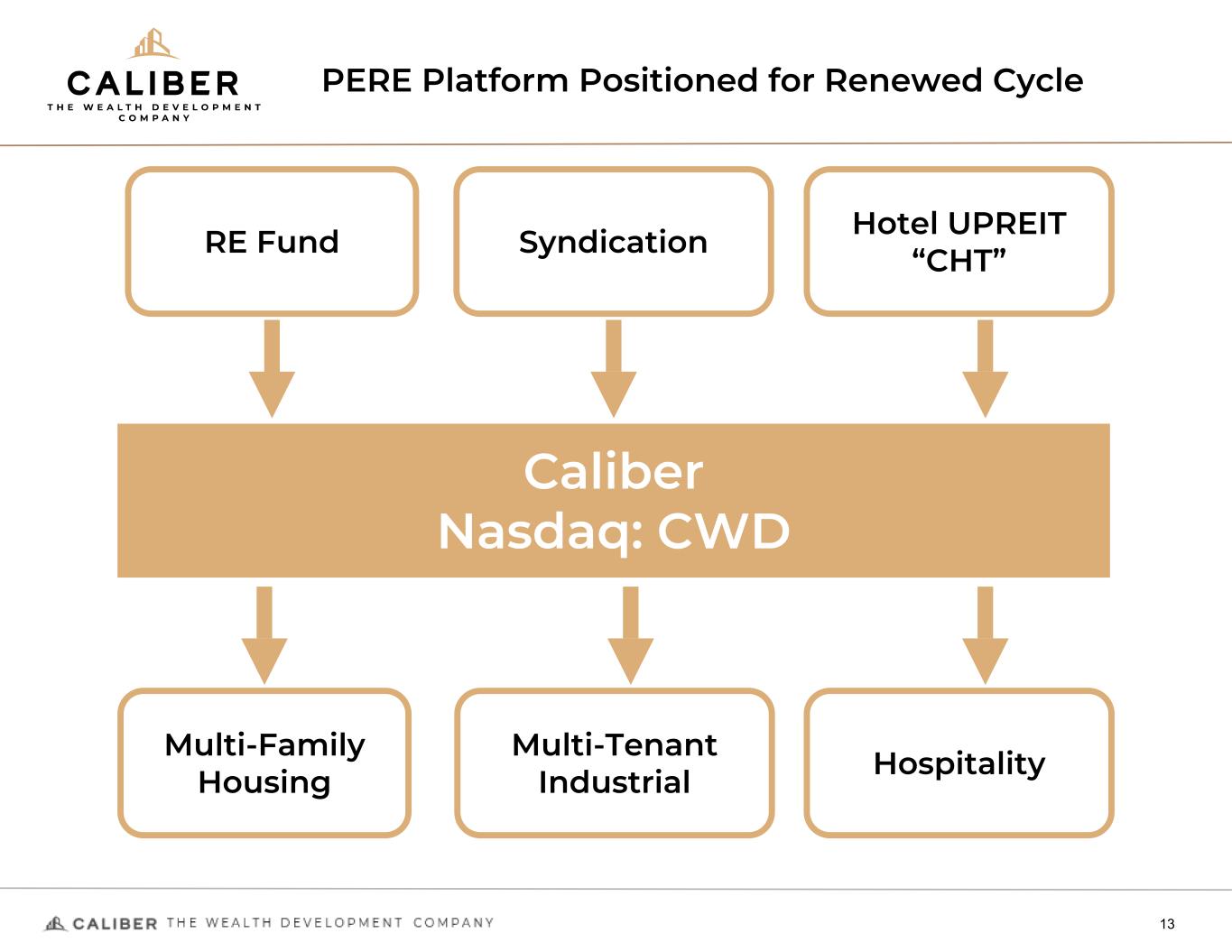 PERE Platform Positioned for Renewed Cycle 13 Caliber Nasdaq: CWD Multi-Family Housing Multi-Tenant Industrial Hospitality RE Fund Syndication Hotel UPREIT “CHT”