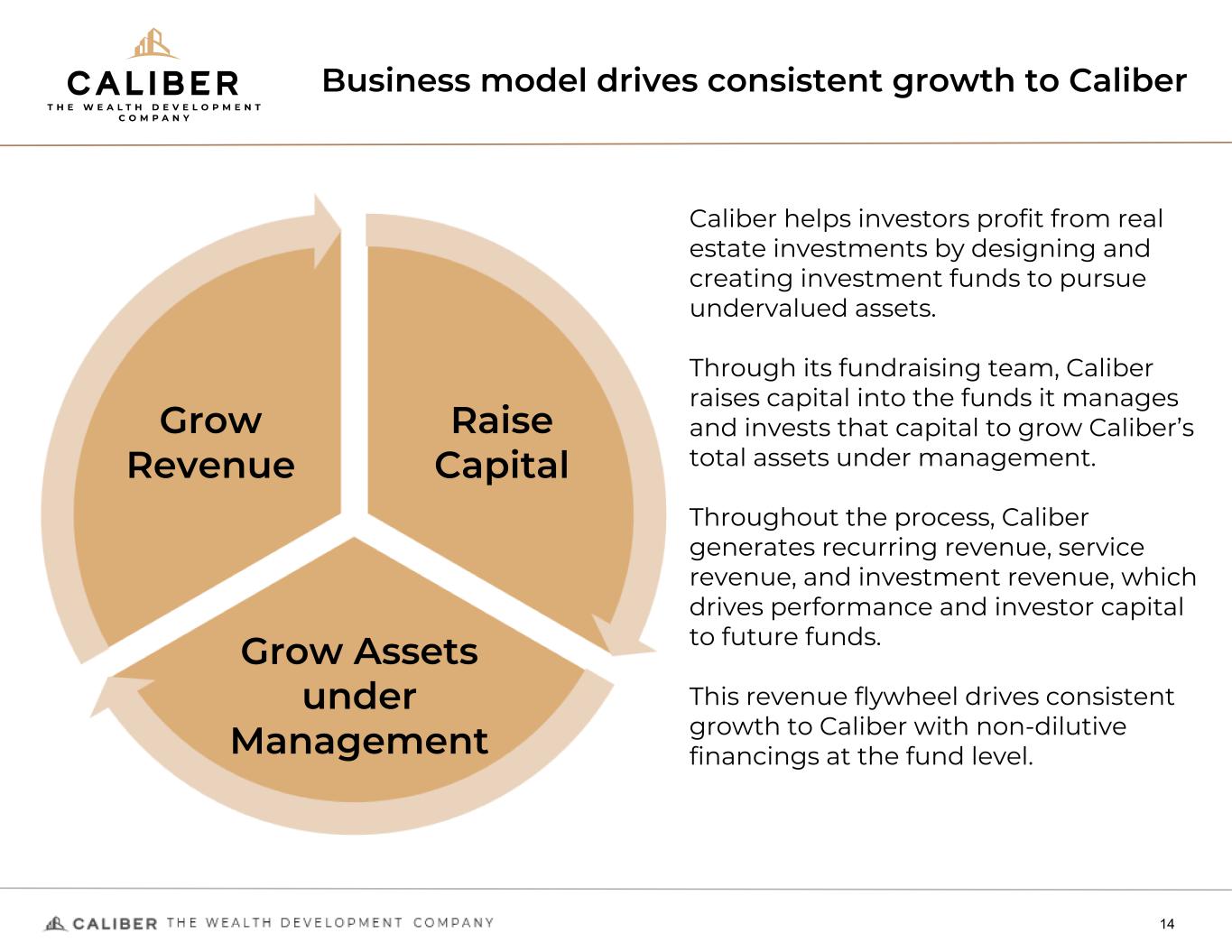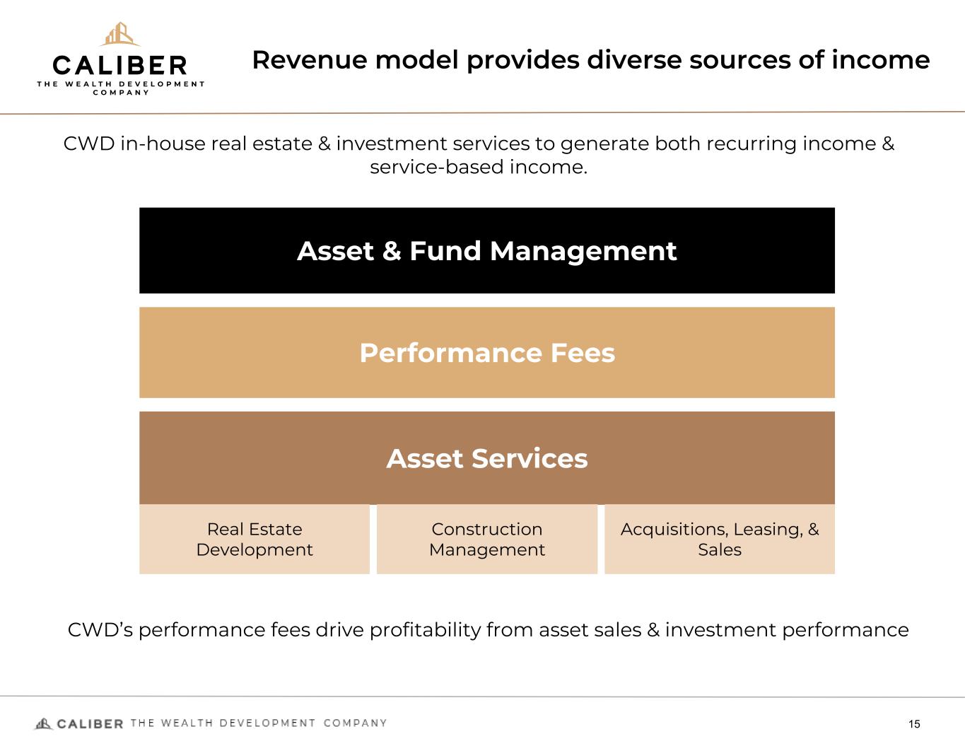 Business model drives consistent growth to Caliber 14 Grow Revenue Raise Capital Grow Assets under Management Caliber helps investors profit from real estate investments by designing and creating investment funds to pursue undervalued assets. Through its fundraising team, Caliber raises capital into the funds it manages and invests that capital to grow Caliber’s total assets under management. Throughout the process, Caliber generates recurring revenue, service revenue, and investment revenue, which drives performance and investor capital to future funds. This revenue flywheel drives consistent growth to Caliber with non-dilutive financings at the fund level.