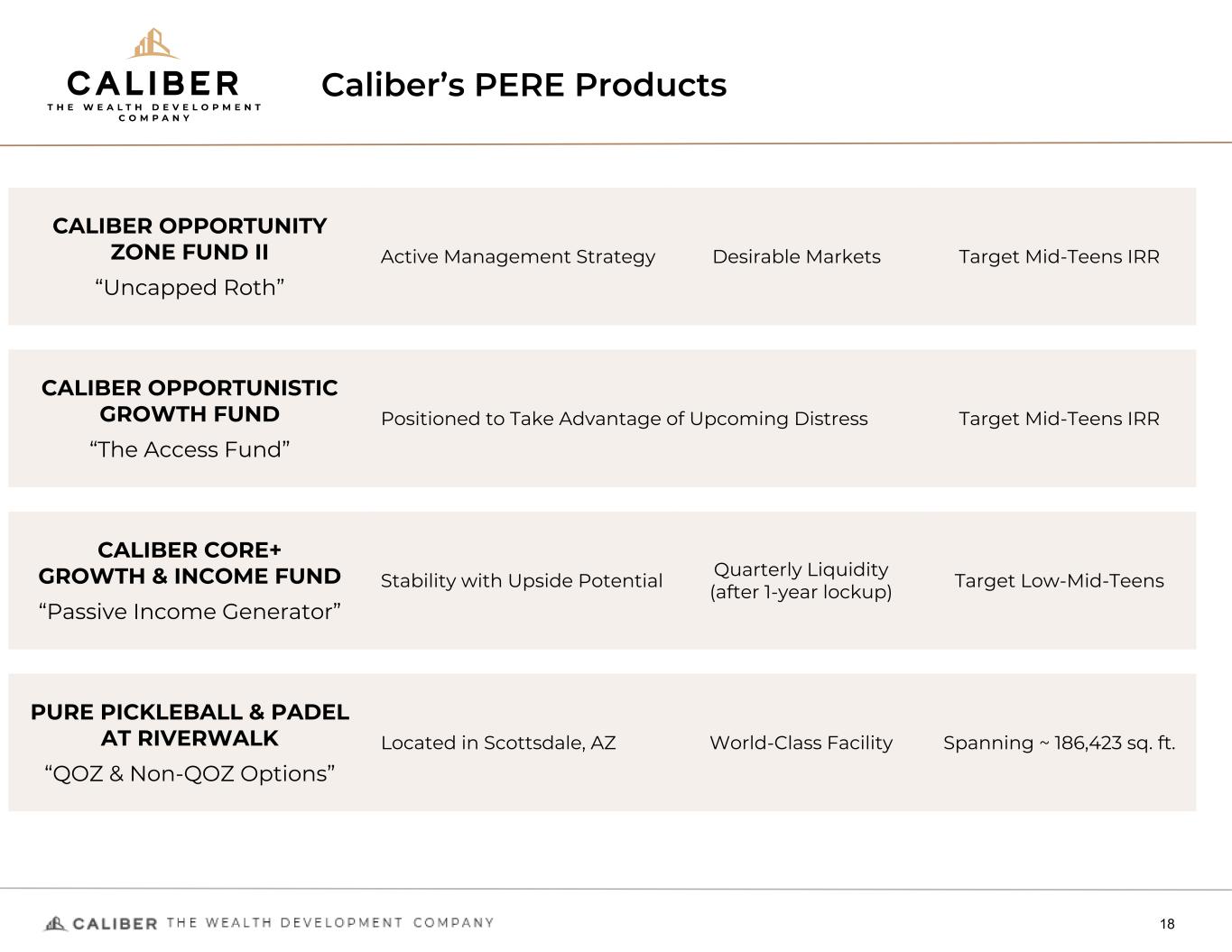 Caliber Solves Its Clients’ Financial Needs 17 Income Lending, CORE Plus, Value Add, CHT Preferred Stock Clients who invest in Caliber’s Funds seek three primary outcomes: Desired Outcome Caliber Fund Growth Distressed and Special Situations, Adaptive Re-Use & Development Tax Planning/ Reduction Opportunity Zone Funds, 1031 Investments Caliber’s Fundraising Engine Can Now Be Applied to Digital Assets High Net- Worth Investors Capital Sources RIA’s & Brokers Family Offices / Institutions