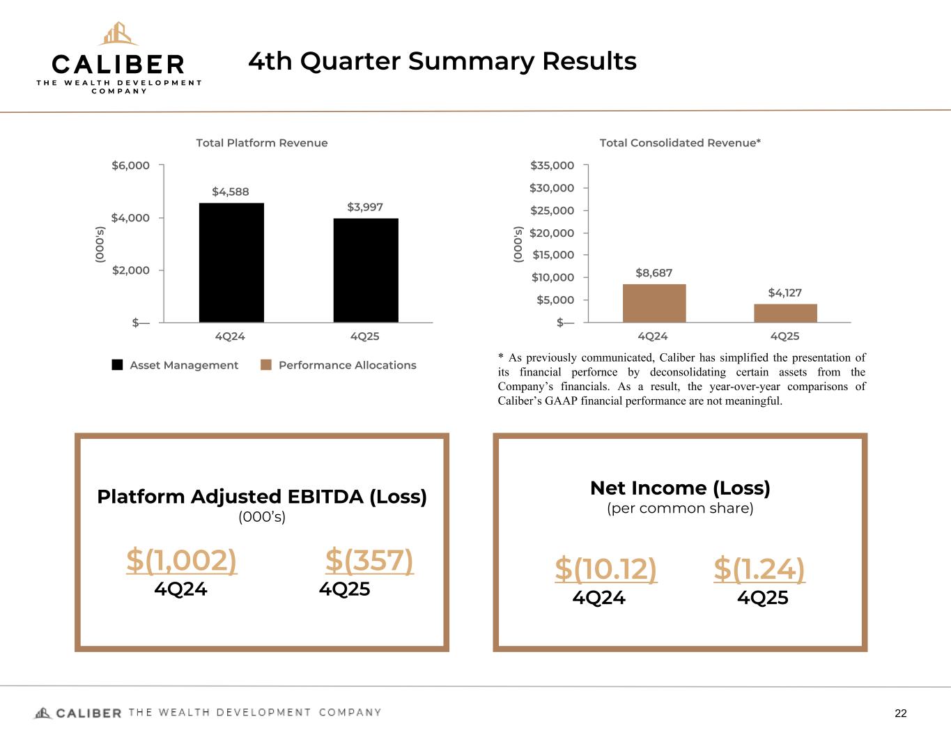 4th Quarter - Historical Summary Results 21 (0 0 0 's ) Total Platform Revenue $7,187 $4,726 $4,212 $7,416 $4,588 $3,549 $4,126 $3,516 $3,997 Asset Management Performance Allocations 4Q23 1Q24 2Q24 3Q24 4Q24 1Q25 2Q25 3Q25 4Q25 $— $2,000 $4,000 $6,000 $8,000 (0 0 0 ,0 0 0 's ) Managed Capital $438 $454 $470 $485 $493 $495 $499 $506 $517 4Q23 1Q24 2Q24 3Q24 4Q24 1Q25 2Q25 3Q25 4Q25 $300 $400 $500 $600 $700 (0 0 0 's ) Adjusted EBITDA $1,553 $2,412 $(1,669) $(2,451) $(1,002) $(1,352) $(54) $(665) $(357) 4Q23 1Q24 2Q24 3Q24 4Q24 1Q25 2Q25 3Q25 4Q25 $(3,000) $(2,000) $(1,000) $— $1,000 $2,000 $3,000 (0 0 0 's ) FV AUM $741 $767 $773 $807 $795 $831 $803 $797 $780 4Q23 1Q24 2Q24 3Q24 4Q24 1Q25 2Q25 3Q25 4Q25 $— $100 $200 $300 $400 $500 $600 $700 $800 $900 $1,000