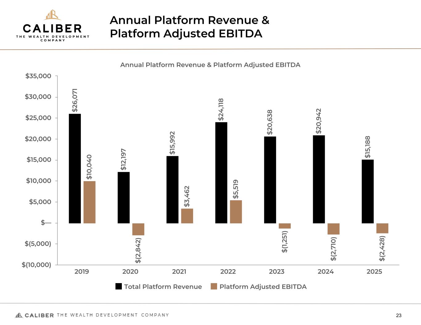4th Quarter Summary Results 22 Platform Adjusted EBITDA (Loss) (000’s) $(1,002) $(357) 4Q24 4Q25 Net Income (Loss) (per common share) $(10.12) $(1.24) 4Q24 4Q25 (0 0 0 's ) Total Platform Revenue $4,588 $3,997 Asset Management Performance Allocations 4Q24 4Q25 $— $2,000 $4,000 $6,000 (0 0 0 's ) Total Consolidated Revenue* $8,687 $4,127 4Q24 4Q25 $— $5,000 $10,000 $15,000 $20,000 $25,000 $30,000 $35,000 * As previously communicated, Caliber has simplified the presentation of its financial perfornce by deconsolidating certain assets from the Company’s financials. As a result, the year-over-year comparisons of Caliber’s GAAP financial performance are not meaningful.
