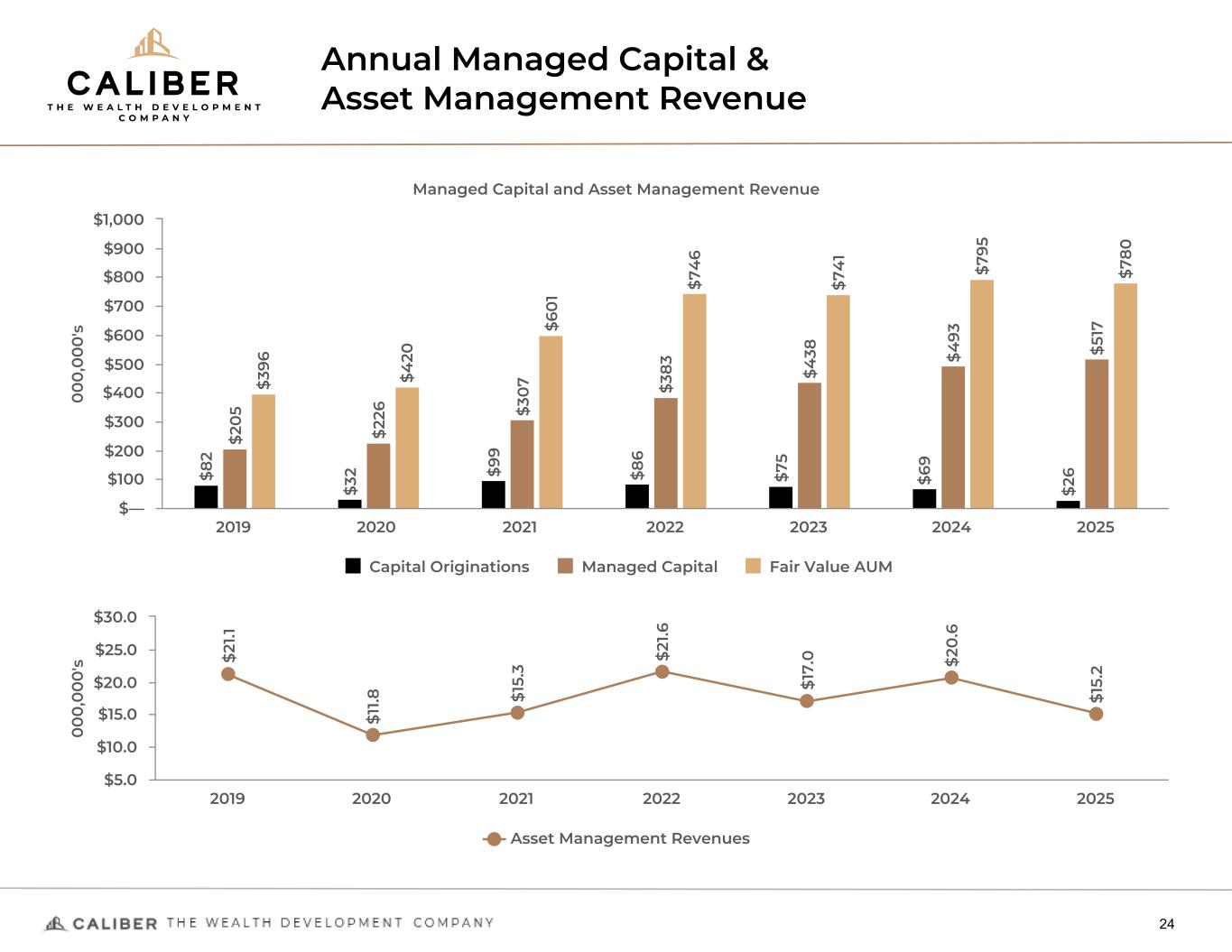 Annual Managed Capital & Asset Management Revenue 24 0 0 0 ,0 0 0 's Managed Capital and Asset Management Revenue $8 2 $3 2 $9 9 $8 6 $7 5 $6 9 $2 6 $2 0 5 $2 26 $3 0 7 $3 83 $4 38 $4 93 $5 17 $3 96 $4 20 $6 0 1 $7 4 6 $7 4 1 $7 95 $7 80 Capital Originations Managed Capital Fair Value AUM 2019 2020 2021 2022 2023 2024 2025 $— $100 $200 $300 $400 $500 $600 $700 $800 $900 $1,000 0 0 0 ,0 0 0 's $2 1.1 $1 1.8 $1 5. 3 $2 1.6 $1 7. 0 $2 0 .6 $1 5. 2 Asset Management Revenues 2019 2020 2021 2022 2023 2024 2025 $5.0 $10.0 $15.0 $20.0 $25.0 $30.0