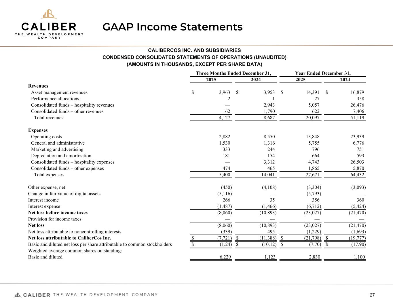GAAP Income Statements 27 CALIBERCOS INC. AND SUBSIDIARIES CONDENSED CONSOLIDATED STATEMENTS OF OPERATIONS (UNAUDITED) (AMOUNTS IN THOUSANDS, EXCEPT PER SHARE DATA) Three Months Ended December 31, Year Ended December 31, 2025 2024 2025 2024 Revenues Asset management revenues $ 3,963 $ 3,953 $ 14,391 $ 16,879 Performance allocations 2 1 27 358 Consolidated funds – hospitality revenues — 2,943 5,057 26,476 Consolidated funds – other revenues 162 1,790 622 7,406 Total revenues 4,127 8,687 20,097 51,119 Expenses Operating costs 2,882 8,550 13,848 23,939 General and administrative 1,530 1,316 5,755 6,776 Marketing and advertising 333 244 796 751 Depreciation and amortization 181 154 664 593 Consolidated funds – hospitality expenses — 3,312 4,743 26,503 Consolidated funds – other expenses 474 465 1,865 5,870 Total expenses 5,400 14,041 27,671 64,432 Other expense, net (450) (4,108) (3,304) (3,093) Change in fair value of digital assets (5,116) — (5,793) — Interest income 266 35 356 360 Interest expense (1,487) (1,466) (6,712) (5,424) Net loss before income taxes (8,060) (10,893) (23,027) (21,470) Provision for income taxes — — — — Net loss (8,060) (10,893) (23,027) (21,470) Net loss attributable to noncontrolling interests (339) 495 (1,229) (1,693) Net loss attributable to CaliberCos Inc. $ (7,721) $ (11,388) $ (21,798) $ (19,777) Basic and diluted net loss per share attributable to common stockholders $ (1.24) $ (10.12) $ (7.70) $ (17.90) Weighted average common shares outstanding: Basic and diluted 6,229 1,123 2,830 1,100