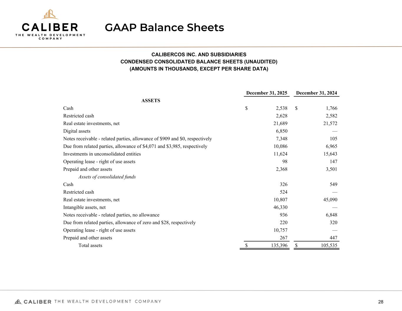 GAAP Balance Sheets 28 CALIBERCOS INC. AND SUBSIDIARIES CONDENSED CONSOLIDATED BALANCE SHEETS (UNAUDITED) (AMOUNTS IN THOUSANDS, EXCEPT PER SHARE DATA) December 31, 2025 December 31, 2024 ASSETS Cash $ 2,538 $ 1,766 Restricted cash 2,628 2,582 Real estate investments, net 21,689 21,572 Digital assets 6,850 — Notes receivable - related parties, allowance of $909 and $0, respectively 7,348 105 Due from related parties, allowance of $4,071 and $3,985, respectively 10,086 6,965 Investments in unconsolidated entities 11,624 15,643 Operating lease - right of use assets 98 147 Prepaid and other assets 2,368 3,501 Assets of consolidated funds Cash 326 549 Restricted cash 524 — Real estate investments, net 10,807 45,090 Intangible assets, net 46,330 — Notes receivable - related parties, no allowance 936 6,848 Due from related parties, allowance of zero and $28, respectively 220 320 Operating lease - right of use assets 10,757 — Prepaid and other assets 267 447 Total assets $ 135,396 $ 105,535