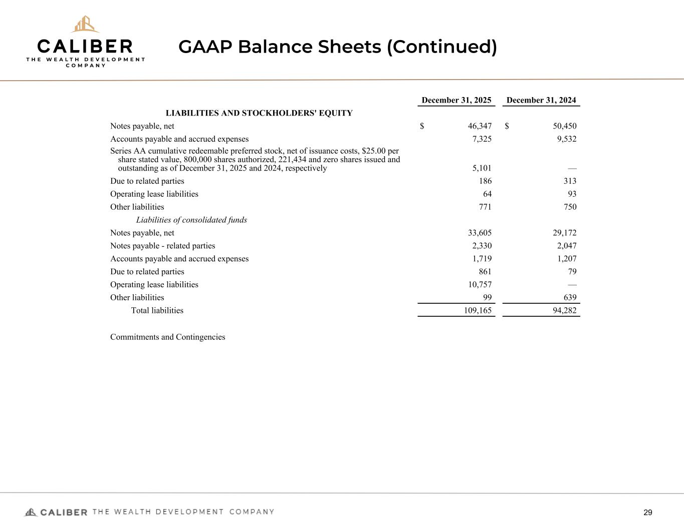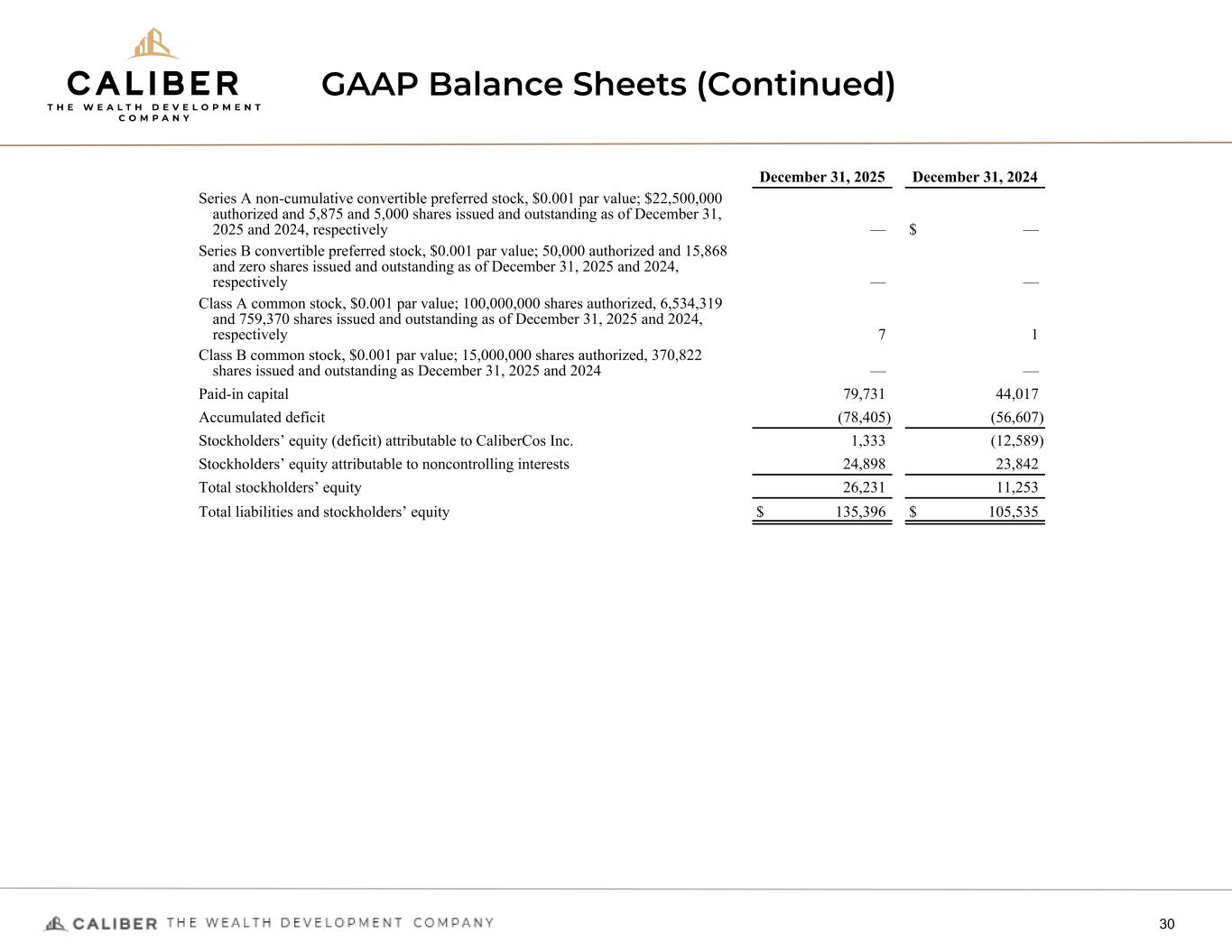 GAAP Balance Sheets (Continued) 30 December 31, 2025 December 31, 2024 Series A non-cumulative convertible preferred stock, $0.001 par value; $22,500,000 authorized and 5,875 and 5,000 shares issued and outstanding as of December 31, 2025 and 2024, respectively — $ — Series B convertible preferred stock, $0.001 par value; 50,000 authorized and 15,868 and zero shares issued and outstanding as of December 31, 2025 and 2024, respectively — — Class A common stock, $0.001 par value; 100,000,000 shares authorized, 6,534,319 and 759,370 shares issued and outstanding as of December 31, 2025 and 2024, respectively 7 1 Class B common stock, $0.001 par value; 15,000,000 shares authorized, 370,822 shares issued and outstanding as December 31, 2025 and 2024 — — Paid-in capital 79,731 44,017 Accumulated deficit (78,405) (56,607) Stockholders’ equity (deficit) attributable to CaliberCos Inc. 1,333 (12,589) Stockholders’ equity attributable to noncontrolling interests 24,898 23,842 Total stockholders’ equity 26,231 11,253 Total liabilities and stockholders’ equity $ 135,396 $ 105,535