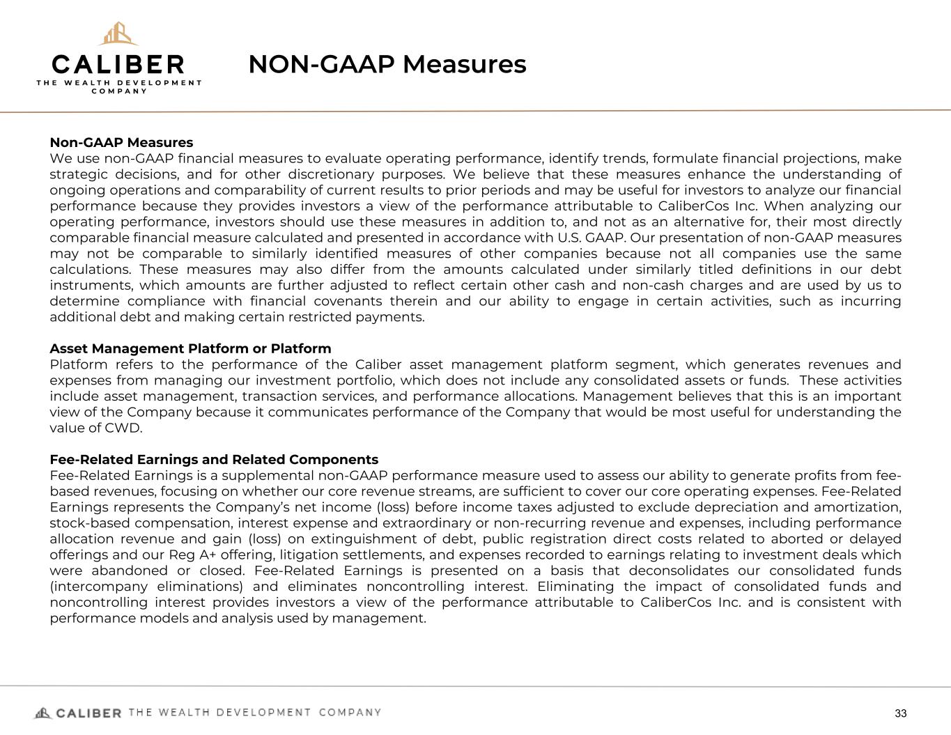 NON-GAAP Measures 33 Non-GAAP Measures We use non-GAAP financial measures to evaluate operating performance, identify trends, formulate financial projections, make strategic decisions, and for other discretionary purposes. We believe that these measures enhance the understanding of ongoing operations and comparability of current results to prior periods and may be useful for investors to analyze our financial performance because they provides investors a view of the performance attributable to CaliberCos Inc. When analyzing our operating performance, investors should use these measures in addition to, and not as an alternative for, their most directly comparable financial measure calculated and presented in accordance with U.S. GAAP. Our presentation of non-GAAP measures may not be comparable to similarly identified measures of other companies because not all companies use the same calculations. These measures may also differ from the amounts calculated under similarly titled definitions in our debt instruments, which amounts are further adjusted to reflect certain other cash and non-cash charges and are used by us to determine compliance with financial covenants therein and our ability to engage in certain activities, such as incurring additional debt and making certain restricted payments. Asset Management Platform or Platform Platform refers to the performance of the Caliber asset management platform segment, which generates revenues and expenses from managing our investment portfolio, which does not include any consolidated assets or funds. These activities include asset management, transaction services, and performance allocations. Management believes that this is an important view of the Company because it communicates performance of the Company that would be most useful for understanding the value of CWD. Fee-Related Earnings and Related Components Fee-Related Earnings is a supplemental non-GAAP performance measure used to assess our ability to generate profits from fee- based revenues, focusing on whether our core revenue streams, are sufficient to cover our core operating expenses. Fee-Related Earnings represents the Company’s net income (loss) before income taxes adjusted to exclude depreciation and amortization, stock-based compensation, interest expense and extraordinary or non-recurring revenue and expenses, including performance allocation revenue and gain (loss) on extinguishment of debt, public registration direct costs related to aborted or delayed offerings and our Reg A+ offering, litigation settlements, and expenses recorded to earnings relating to investment deals which were abandoned or closed. Fee-Related Earnings is presented on a basis that deconsolidates our consolidated funds (intercompany eliminations) and eliminates noncontrolling interest. Eliminating the impact of consolidated funds and noncontrolling interest provides investors a view of the performance attributable to CaliberCos Inc. and is consistent with performance models and analysis used by management.