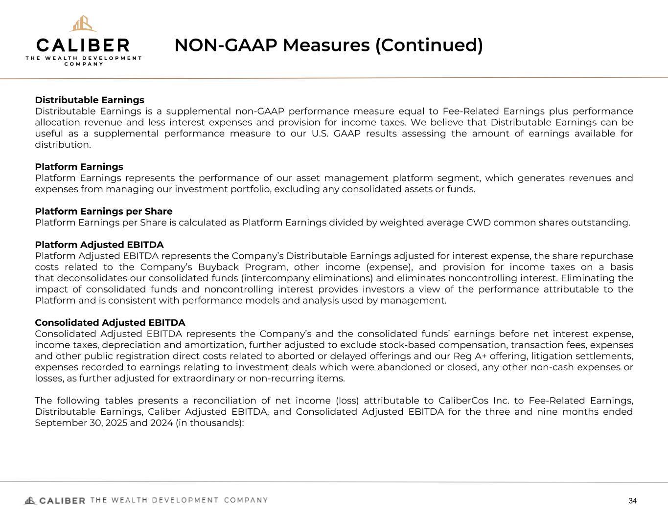 NON-GAAP Measures (Continued) 34 Distributable Earnings Distributable Earnings is a supplemental non-GAAP performance measure equal to Fee-Related Earnings plus performance allocation revenue and less interest expenses and provision for income taxes. We believe that Distributable Earnings can be useful as a supplemental performance measure to our U.S. GAAP results assessing the amount of earnings available for distribution. Platform Earnings Platform Earnings represents the performance of our asset management platform segment, which generates revenues and expenses from managing our investment portfolio, excluding any consolidated assets or funds. Platform Earnings per Share Platform Earnings per Share is calculated as Platform Earnings divided by weighted average CWD common shares outstanding. Platform Adjusted EBITDA Platform Adjusted EBITDA represents the Company’s Distributable Earnings adjusted for interest expense, the share repurchase costs related to the Company’s Buyback Program, other income (expense), and provision for income taxes on a basis that deconsolidates our consolidated funds (intercompany eliminations) and eliminates noncontrolling interest. Eliminating the impact of consolidated funds and noncontrolling interest provides investors a view of the performance attributable to the Platform and is consistent with performance models and analysis used by management. Consolidated Adjusted EBITDA Consolidated Adjusted EBITDA represents the Company’s and the consolidated funds’ earnings before net interest expense, income taxes, depreciation and amortization, further adjusted to exclude stock-based compensation, transaction fees, expenses and other public registration direct costs related to aborted or delayed offerings and our Reg A+ offering, litigation settlements, expenses recorded to earnings relating to investment deals which were abandoned or closed, any other non-cash expenses or losses, as further adjusted for extraordinary or non-recurring items. The following tables presents a reconciliation of net income (loss) attributable to CaliberCos Inc. to Fee-Related Earnings, Distributable Earnings, Caliber Adjusted EBITDA, and Consolidated Adjusted EBITDA for the three and nine months ended September 30, 2025 and 2024 (in thousands):