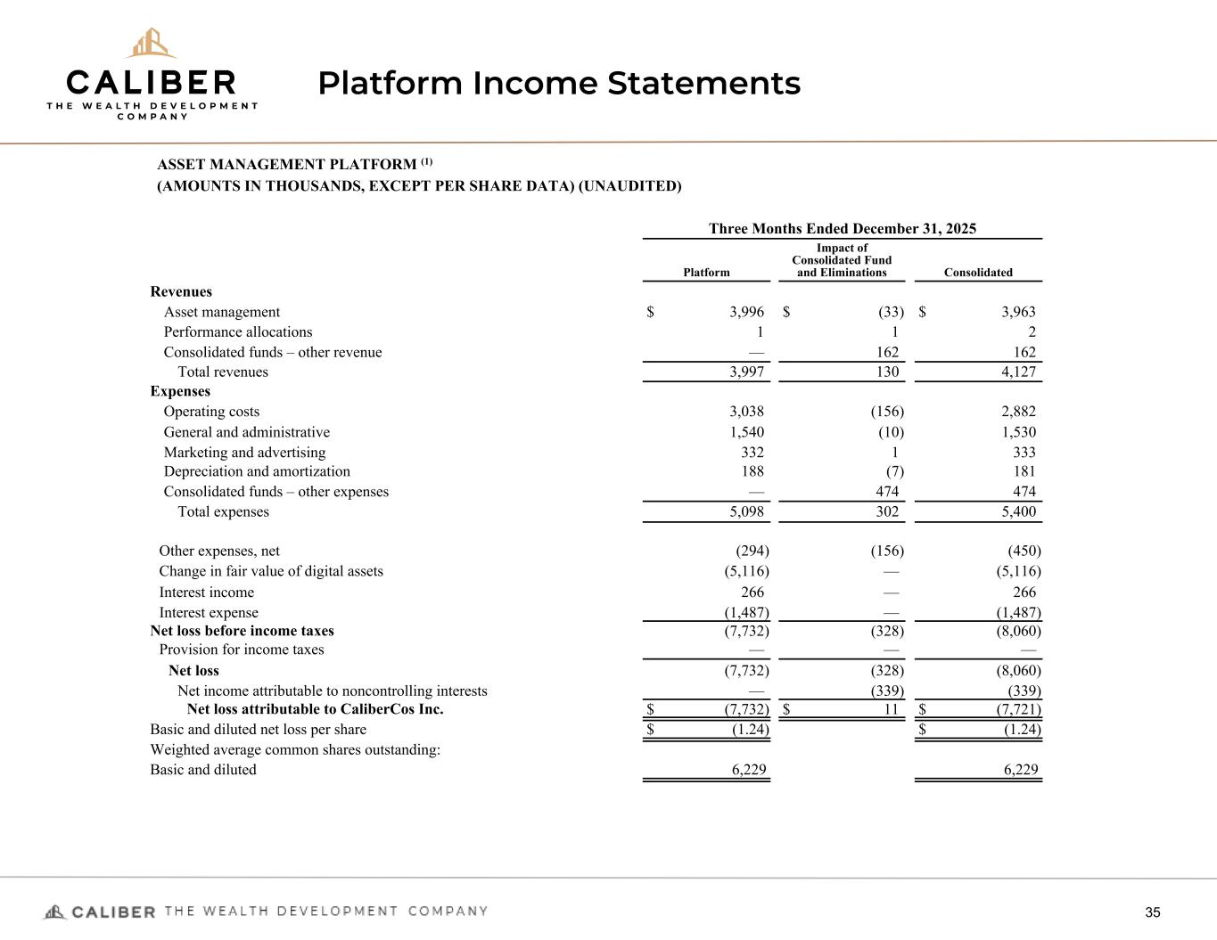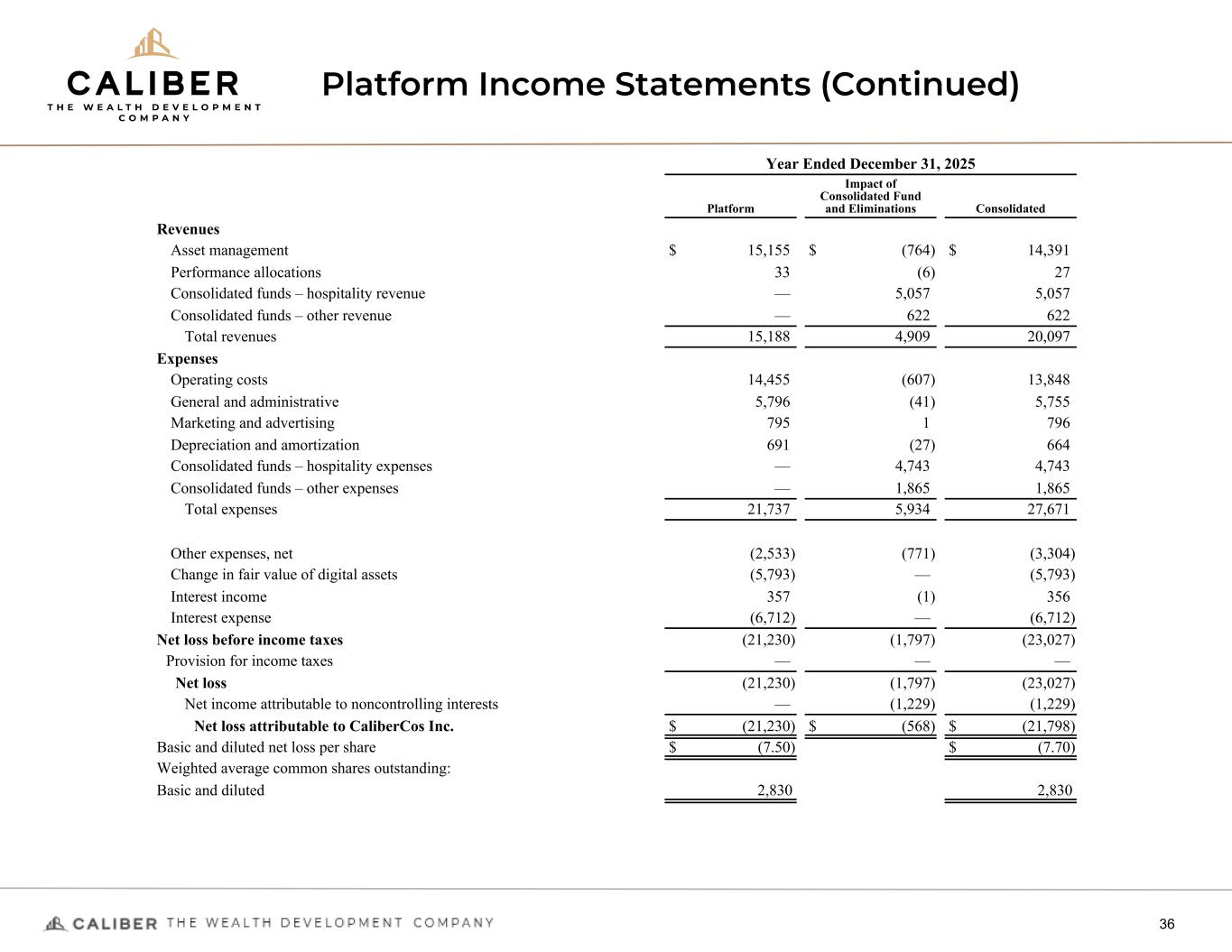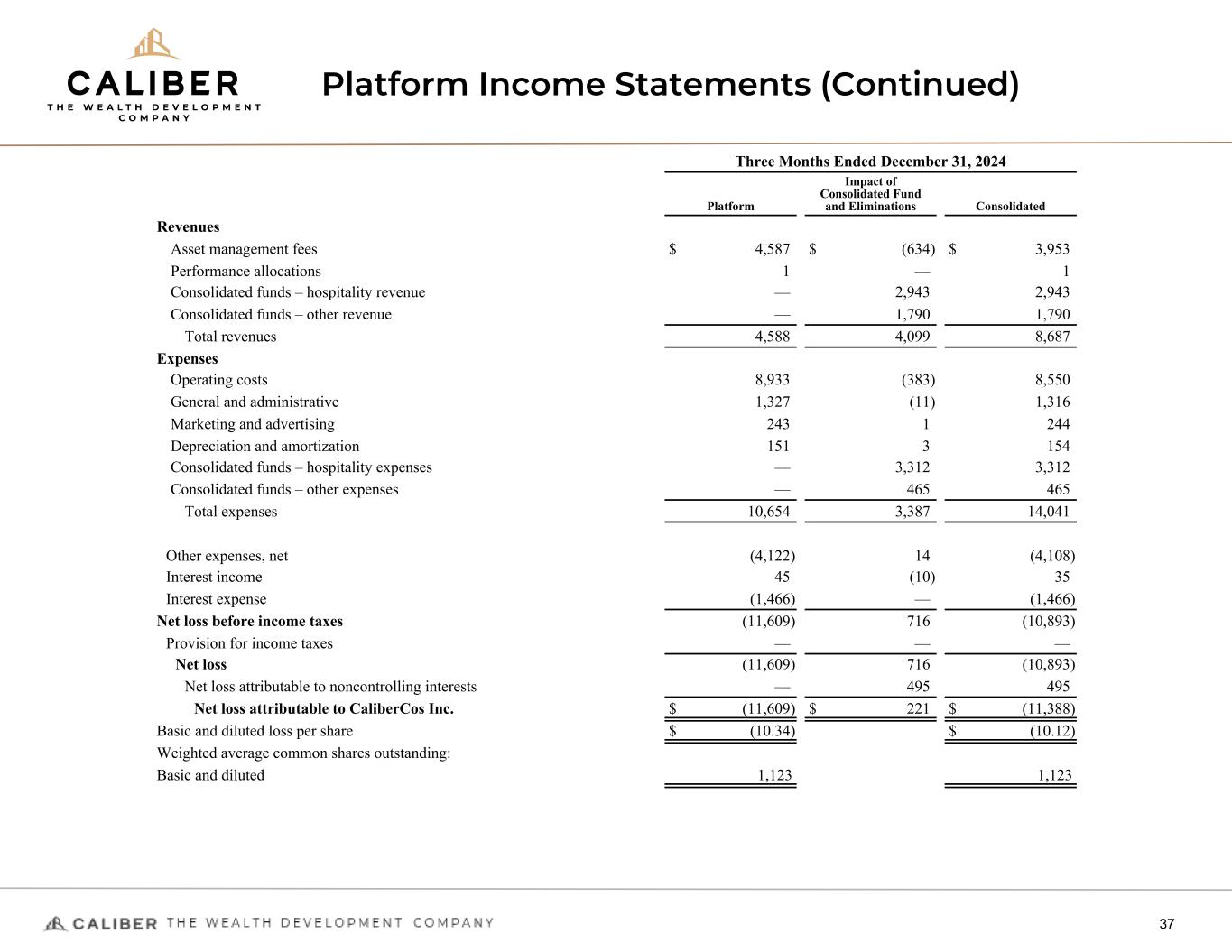 Platform Income Statements (Continued) 36 Year Ended December 31, 2025 Platform Impact of Consolidated Fund and Eliminations Consolidated Revenues Asset management $ 15,155 $ (764) $ 14,391 Performance allocations 33 (6) 27 Consolidated funds – hospitality revenue — 5,057 5,057 Consolidated funds – other revenue — 622 622 Total revenues 15,188 4,909 20,097 Expenses Operating costs 14,455 (607) 13,848 General and administrative 5,796 (41) 5,755 Marketing and advertising 795 1 796 Depreciation and amortization 691 (27) 664 Consolidated funds – hospitality expenses — 4,743 4,743 Consolidated funds – other expenses — 1,865 1,865 Total expenses 21,737 5,934 27,671 Other expenses, net (2,533) (771) (3,304) Change in fair value of digital assets (5,793) — (5,793) Interest income 357 (1) 356 Interest expense (6,712) — (6,712) Net loss before income taxes (21,230) (1,797) (23,027) Provision for income taxes — — — Net loss (21,230) (1,797) (23,027) Net income attributable to noncontrolling interests — (1,229) (1,229) Net loss attributable to CaliberCos Inc. $ (21,230) $ (568) $ (21,798) Basic and diluted net loss per share $ (7.50) $ (7.70) Weighted average common shares outstanding: Basic and diluted 2,830 2,830