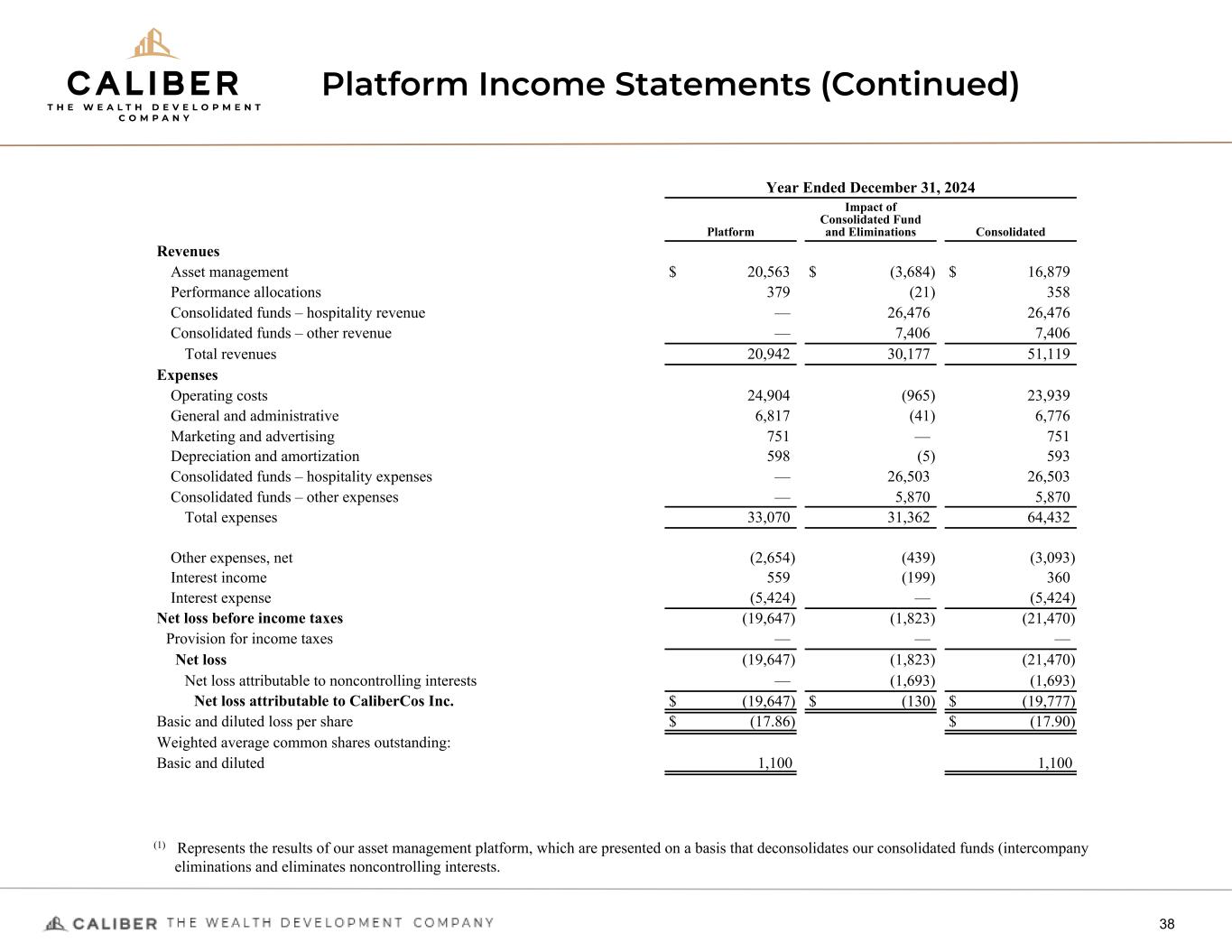 Platform Income Statements (Continued) 37 Three Months Ended December 31, 2024 Platform Impact of Consolidated Fund and Eliminations Consolidated Revenues Asset management fees $ 4,587 $ (634) $ 3,953 Performance allocations 1 — 1 Consolidated funds – hospitality revenue — 2,943 2,943 Consolidated funds – other revenue — 1,790 1,790 Total revenues 4,588 4,099 8,687 Expenses Operating costs 8,933 (383) 8,550 General and administrative 1,327 (11) 1,316 Marketing and advertising 243 1 244 Depreciation and amortization 151 3 154 Consolidated funds – hospitality expenses — 3,312 3,312 Consolidated funds – other expenses — 465 465 Total expenses 10,654 3,387 14,041 Other expenses, net (4,122) 14 (4,108) Interest income 45 (10) 35 Interest expense (1,466) — (1,466) Net loss before income taxes (11,609) 716 (10,893) Provision for income taxes — — — Net loss (11,609) 716 (10,893) Net loss attributable to noncontrolling interests — 495 495 Net loss attributable to CaliberCos Inc. $ (11,609) $ 221 $ (11,388) Basic and diluted loss per share $ (10.34) $ (10.12) Weighted average common shares outstanding: Basic and diluted 1,123 1,123
