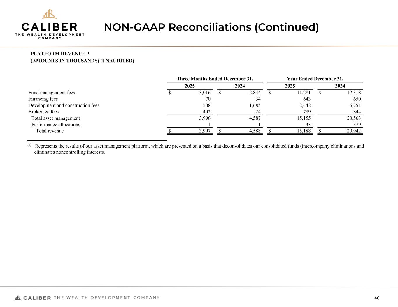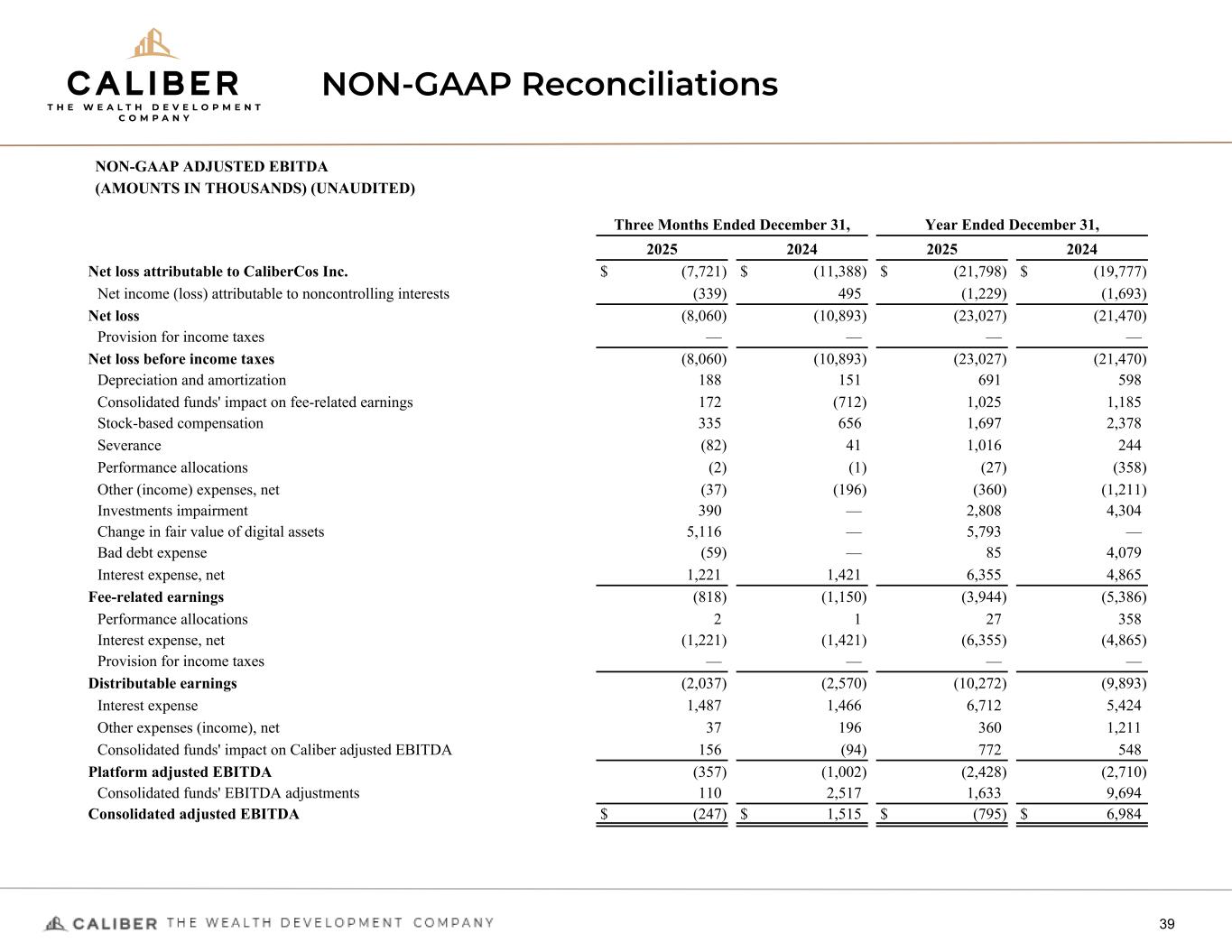 NON-GAAP Reconciliations 39 NON-GAAP ADJUSTED EBITDA (AMOUNTS IN THOUSANDS) (UNAUDITED) Three Months Ended December 31, Year Ended December 31, 2025 2024 2025 2024 Net loss attributable to CaliberCos Inc. $ (7,721) $ (11,388) $ (21,798) $ (19,777) Net income (loss) attributable to noncontrolling interests (339) 495 (1,229) (1,693) Net loss (8,060) (10,893) (23,027) (21,470) Provision for income taxes — — — — Net loss before income taxes (8,060) (10,893) (23,027) (21,470) Depreciation and amortization 188 151 691 598 Consolidated funds' impact on fee-related earnings 172 (712) 1,025 1,185 Stock-based compensation 335 656 1,697 2,378 Severance (82) 41 1,016 244 Performance allocations (2) (1) (27) (358) Other (income) expenses, net (37) (196) (360) (1,211) Investments impairment 390 — 2,808 4,304 Change in fair value of digital assets 5,116 — 5,793 — Bad debt expense (59) — 85 4,079 Interest expense, net 1,221 1,421 6,355 4,865 Fee-related earnings (818) (1,150) (3,944) (5,386) Performance allocations 2 1 27 358 Interest expense, net (1,221) (1,421) (6,355) (4,865) Provision for income taxes — — — — Distributable earnings (2,037) (2,570) (10,272) (9,893) Interest expense 1,487 1,466 6,712 5,424 Other expenses (income), net 37 196 360 1,211 Consolidated funds' impact on Caliber adjusted EBITDA 156 (94) 772 548 Platform adjusted EBITDA (357) (1,002) (2,428) (2,710) Consolidated funds' EBITDA adjustments 110 2,517 1,633 9,694 Consolidated adjusted EBITDA $ (247) $ 1,515 $ (795) $ 6,984