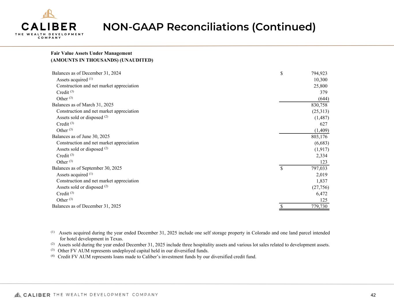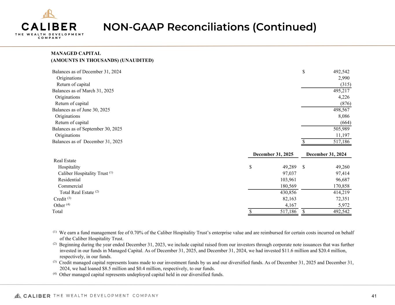 NON-GAAP Reconciliations (Continued) 41 MANAGED CAPITAL (AMOUNTS IN THOUSANDS) (UNAUDITED) Balances as of December 31, 2024 $ 492,542 Originations 2,990 Return of capital (315) Balances as of March 31, 2025 495,217 Originations 4,226 Return of capital (876) Balances as of June 30, 2025 498,567 Originations 8,086 Return of capital (664) Balances as of September 30, 2025 505,989 Originations 11,197 Balances as of December 31, 2025 $ 517,186 December 31, 2025 December 31, 2024 Real Estate Hospitality $ 49,289 $ 49,260 Caliber Hospitality Trust (1) 97,037 97,414 Residential 103,961 96,687 Commercial 180,569 170,858 Total Real Estate (2) 430,856 414,219 Credit (3) 82,163 72,351 Other (4) 4,167 5,972 Total $ 517,186 $ 492,542 (1) We earn a fund management fee of 0.70% of the Caliber Hospitality Trust’s enterprise value and are reimbursed for certain costs incurred on behalf of the Caliber Hospitality Trust. (2) Beginning during the year ended December 31, 2023, we include capital raised from our investors through corporate note issuances that was further invested in our funds in Managed Capital. As of December 31, 2025, and December 31, 2024, we had invested $11.6 million and $20.4 million, respectively, in our funds. (3) Credit managed capital represents loans made to our investment funds by us and our diversified funds. As of December 31, 2025 and December 31, 2024, we had loaned $8.5 million and $0.4 million, respectively, to our funds. (4) Other managed capital represents undeployed capital held in our diversified funds.