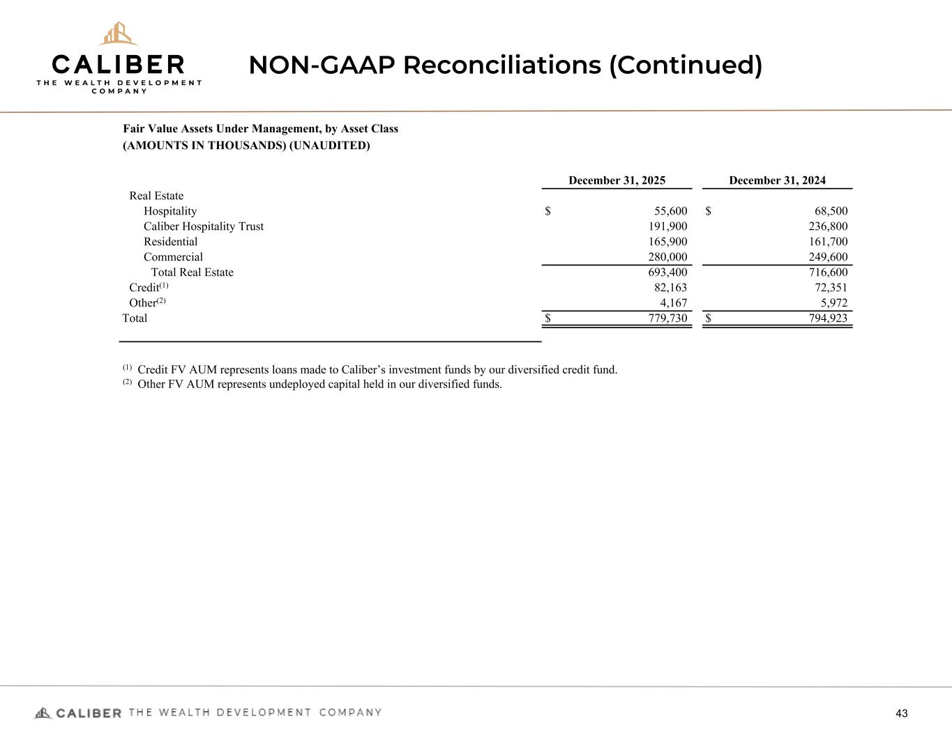 NON-GAAP Reconciliations (Continued) 42 Fair Value Assets Under Management (AMOUNTS IN THOUSANDS) (UNAUDITED) Balances as of December 31, 2024 $ 794,923 Assets acquired (1) 10,300 Construction and net market appreciation 25,800 Credit (3) 379 Other (3) (644) Balances as of March 31, 2025 830,758 Construction and net market appreciation (25,313) Assets sold or disposed (2) (1,487) Credit (3) 627 Other (3) (1,409) Balances as of June 30, 2025 803,176 Construction and net market appreciation (6,683) Assets sold or disposed (2) (1,917) Credit (3) 2,334 Other (3) 123 Balances as of September 30, 2025 $ 797,033 Assets acquired (1) 2,019 Construction and net market appreciation 1,837 Assets sold or disposed (2) (27,756) Credit (3) 6,472 Other (3) 125 Balances as of December 31, 2025 $ 779,730 (1) Assets acquired during the year ended December 31, 2025 include one self storage property in Colorado and one land parcel intended for hotel development in Texas. (2) Assets sold during the year ended December 31, 2025 include three hospitality assets and various lot sales related to development assets. (3) Other FV AUM represents undeployed capital held in our diversified funds. (4) Credit FV AUM represents loans made to Caliber’s investment funds by our diversified credit fund.