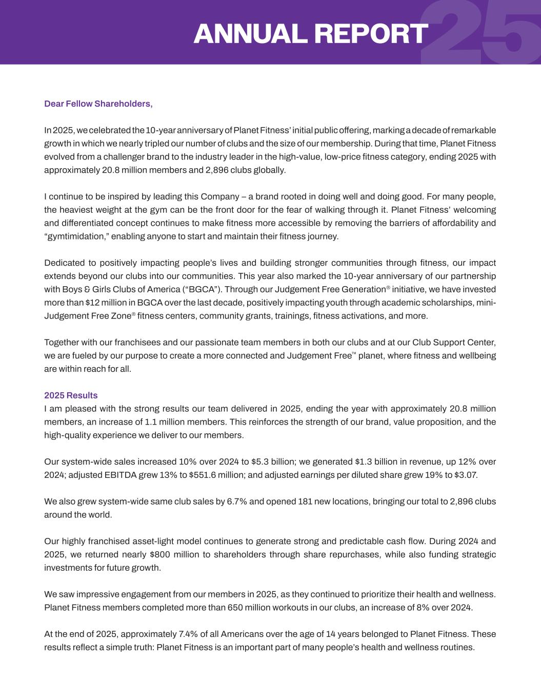 25 Dear Fellow Shareholders, In 2025, we celebrated the 10-year anniversary of Planet Fitness’ initial public offering, marking a decade of remarkable growth in which we nearly tripled our number of clubs and the size of our membership. During that time, Planet Fitness evolved from a challenger brand to the industry leader in the high-value, low-price fitness category, ending 2025 with approximately 20.8 million members and 2,896 clubs globally. I continue to be inspired by leading this Company – a brand rooted in doing well and doing good. For many people, the heaviest weight at the gym can be the front door for the fear of walking through it. Planet Fitness’ welcoming and differentiated concept continues to make fitness more accessible by removing the barriers of affordability and “gymtimidation,” enabling anyone to start and maintain their fitness journey. Dedicated to positively impacting people’s lives and building stronger communities through fitness, our impact extends beyond our clubs into our communities. This year also marked the 10-year anniversary of our partnership with Boys & Girls Clubs of America (“BGCA”). Through our Judgement Free Generation® initiative, we have invested more than $12 million in BGCA over the last decade, positively impacting youth through academic scholarships, mini- Judgement Free Zone® fitness centers, community grants, trainings, fitness activations, and more. Together with our franchisees and our passionate team members in both our clubs and at our Club Support Center, we are fueled by our purpose to create a more connected and Judgement Free™ planet, where fitness and wellbeing are within reach for all. 2025 Results I am pleased with the strong results our team delivered in 2025, ending the year with approximately 20.8 million members, an increase of 1.1 million members. This reinforces the strength of our brand, value proposition, and the high-quality experience we deliver to our members. Our system-wide sales increased 10% over 2024 to $5.3 billion; we generated $1.3 billion in revenue, up 12% over 2024; adjusted EBITDA grew 13% to $551.6 million; and adjusted earnings per diluted share grew 19% to $3.07. We also grew system-wide same club sales by 6.7% and opened 181 new locations, bringing our total to 2,896 clubs around the world. Our highly franchised asset-light model continues to generate strong and predictable cash flow. During 2024 and 2025, we returned nearly $800 million to shareholders through share repurchases, while also funding strategic investments for future growth. We saw impressive engagement from our members in 2025, as they continued to prioritize their health and wellness. Planet Fitness members completed more than 650 million workouts in our clubs, an increase of 8% over 2024. At the end of 2025, approximately 7.4% of all Americans over the age of 14 years belonged to Planet Fitness. These results reflect a simple truth: Planet Fitness is an important part of many people’s health and wellness routines. ANNUAL REPORT