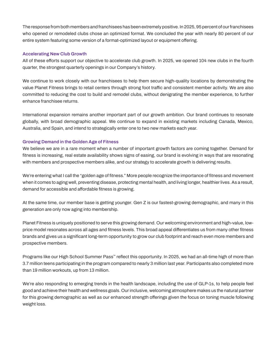 The response from both members and franchisees has been extremely positive. In 2025, 95 percent of our franchisees who opened or remodeled clubs chose an optimized format. We concluded the year with nearly 80 percent of our entire system featuring some version of a format-optimized layout or equipment offering. Accelerating New Club Growth All of these efforts support our objective to accelerate club growth. In 2025, we opened 104 new clubs in the fourth quarter, the strongest quarterly openings in our Company’s history. We continue to work closely with our franchisees to help them secure high-quality locations by demonstrating the value Planet Fitness brings to retail centers through strong foot traffic and consistent member activity. We are also committed to reducing the cost to build and remodel clubs, without denigrating the member experience, to further enhance franchisee returns. International expansion remains another important part of our growth ambition. Our brand continues to resonate globally, with broad demographic appeal. We continue to expand in existing markets including Canada, Mexico, Australia, and Spain, and intend to strategically enter one to two new markets each year. Growing Demand in the Golden Age of Fitness We believe we are in a rare moment when a number of important growth factors are coming together. Demand for fitness is increasing, real estate availability shows signs of easing, our brand is evolving in ways that are resonating with members and prospective members alike, and our strategy to accelerate growth is delivering results. We’re entering what I call the “golden age of fitness.” More people recognize the importance of fitness and movement when it comes to aging well, preventing disease, protecting mental health, and living longer, healthier lives. As a result, demand for accessible and affordable fitness is growing. At the same time, our member base is getting younger. Gen Z is our fastest-growing demographic, and many in this generation are only now aging into membership. Planet Fitness is uniquely positioned to serve this growing demand. Our welcoming environment and high-value, low- price model resonates across all ages and fitness levels. This broad appeal differentiates us from many other fitness brands and gives us a significant long-term opportunity to grow our club footprint and reach even more members and prospective members. Programs like our High School Summer Pass™ reflect this opportunity. In 2025, we had an all-time high of more than 3.7 million teens participating in the program compared to nearly 3 million last year. Participants also completed more than 19 million workouts, up from 13 million. We’re also responding to emerging trends in the health landscape, including the use of GLP-1s, to help people feel good and achieve their health and wellness goals. Our inclusive, welcoming atmosphere makes us the natural partner for this growing demographic as well as our enhanced strength offerings given the focus on toning muscle following weight loss.