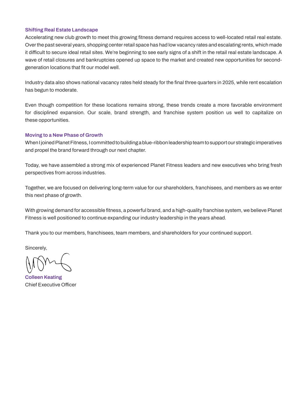 Shifting Real Estate Landscape Accelerating new club growth to meet this growing fitness demand requires access to well-located retail real estate. Over the past several years, shopping center retail space has had low vacancy rates and escalating rents, which made it difficult to secure ideal retail sites. We’re beginning to see early signs of a shift in the retail real estate landscape. A wave of retail closures and bankruptcies opened up space to the market and created new opportunities for second- generation locations that fit our model well. Industry data also shows national vacancy rates held steady for the final three quarters in 2025, while rent escalation has begun to moderate. Even though competition for these locations remains strong, these trends create a more favorable environment for disciplined expansion. Our scale, brand strength, and franchise system position us well to capitalize on these opportunities. Moving to a New Phase of Growth When I joined Planet Fitness, I committed to building a blue-ribbon leadership team to support our strategic imperatives and propel the brand forward through our next chapter. Today, we have assembled a strong mix of experienced Planet Fitness leaders and new executives who bring fresh perspectives from across industries. Together, we are focused on delivering long-term value for our shareholders, franchisees, and members as we enter this next phase of growth. With growing demand for accessible fitness, a powerful brand, and a high-quality franchise system, we believe Planet Fitness is well positioned to continue expanding our industry leadership in the years ahead. Thank you to our members, franchisees, team members, and shareholders for your continued support. Sincerely, Colleen Keating Chief Executive Officer