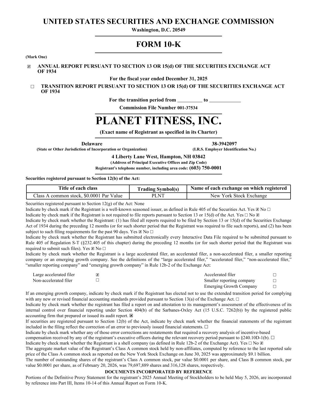 UNITED STATES SECURITIES AND EXCHANGE COMMISSION Washington, D.C. 20549 FORM 10-K (Mark One) ☒ ANNUAL REPORT PURSUANT TO SECTION 13 OR 15(d) OF THE SECURITIES EXCHANGE ACT OF 1934 For the fiscal year ended December 31, 2025 ☐ TRANSITION REPORT PURSUANT TO SECTION 13 OR 15(d) OF THE SECURITIES EXCHANGE ACT OF 1934 For the transition period from to Commission File Number 001-37534 PLANET FITNESS, INC. (Exact name of Registrant as specified in its Charter) Delaware 38-3942097 (State or Other Jurisdiction of Incorporation or Organization) (I.R.S. Employer Identification No.) 4 Liberty Lane West, Hampton, NH 03842 (Address of Principal Executive Offices and Zip Code) Registrant’s telephone number, including area code: (603) 750-0001 Securities registered pursuant to Section 12(b) of the Act: Title of each class Trading Symbol(s) Name of each exchange on which registered Class A common stock, $0.0001 Par Value PLNT New York Stock Exchange Securities registered pursuant to Section 12(g) of the Act: None Indicate by check mark if the Registrant is a well-known seasoned issuer, as defined in Rule 405 of the Securities Act. Yes ☒ No ☐ Indicate by check mark if the Registrant is not required to file reports pursuant to Section 13 or 15(d) of the Act. Yes ☐ No ☒ Indicate by check mark whether the Registrant: (1) has filed all reports required to be filed by Section 13 or 15(d) of the Securities Exchange Act of 1934 during the preceding 12 months (or for such shorter period that the Registrant was required to file such reports), and (2) has been subject to such filing requirements for the past 90 days. Yes ☒ No ☐ Indicate by check mark whether the Registrant has submitted electronically every Interactive Data File required to be submitted pursuant to Rule 405 of Regulation S-T (§232.405 of this chapter) during the preceding 12 months (or for such shorter period that the Registrant was required to submit such files). Yes ☒ No ☐ Indicate by check mark whether the Registrant is a large accelerated filer, an accelerated filer, a non-accelerated filer, a smaller reporting company or an emerging growth company. See the definitions of the “large accelerated filer,” “accelerated filer,” “non-accelerated filer,” “smaller reporting company” and “emerging growth company” in Rule 12b-2 of the Exchange Act: Large accelerated filer ☒ Accelerated filer ☐ Non-accelerated filer ☐ Smaller reporting company ☐ Emerging Growth Company ☐ If an emerging growth company, indicate by check mark if the Registrant has elected not to use the extended transition period for complying with any new or revised financial accounting standards provided pursuant to Section 13(a) of the Exchange Act. ☐ Indicate by check mark whether the registrant has filed a report on and attestation to its management’s assessment of the effectiveness of its internal control over financial reporting under Section 404(b) of the Sarbanes-Oxley Act (15 U.S.C. 7262(b)) by the registered public accounting firm that prepared or issued its audit report. ☒ If securities are registered pursuant to Section 12(b) of the Act, indicate by check mark whether the financial statements of the registrant included in the filing reflect the correction of an error to previously issued financial statements. ☐ Indicate by check mark whether any of those error corrections are restatements that required a recovery analysis of incentive-based compensation received by any of the registrant’s executive officers during the relevant recovery period pursuant to §240.10D-1(b). ☐ Indicate by check mark whether the Registrant is a shell company (as defined in Rule 12b-2 of the Exchange Act). Yes ☐ No ☒ The aggregate market value of the Registrant’s Class A common stock held by non-affiliates, computed by reference to the last reported sale price of the Class A common stock as reported on the New York Stock Exchange on June 30, 2025 was approximately $9.1 billion. The number of outstanding shares of the registrant’s Class A common stock, par value $0.0001 per share, and Class B common stock, par value $0.0001 per share, as of February 20, 2026, was 79,697,889 shares and 316,128 shares, respectively. DOCUMENTS INCORPORATED BY REFERENCE Portions of the Definitive Proxy Statement for the registrant’s 2025 Annual Meeting of Stockholders to be held May 5, 2026, are incorporated by reference into Part III, Items 10-14 of this Annual Report on Form 10-K.