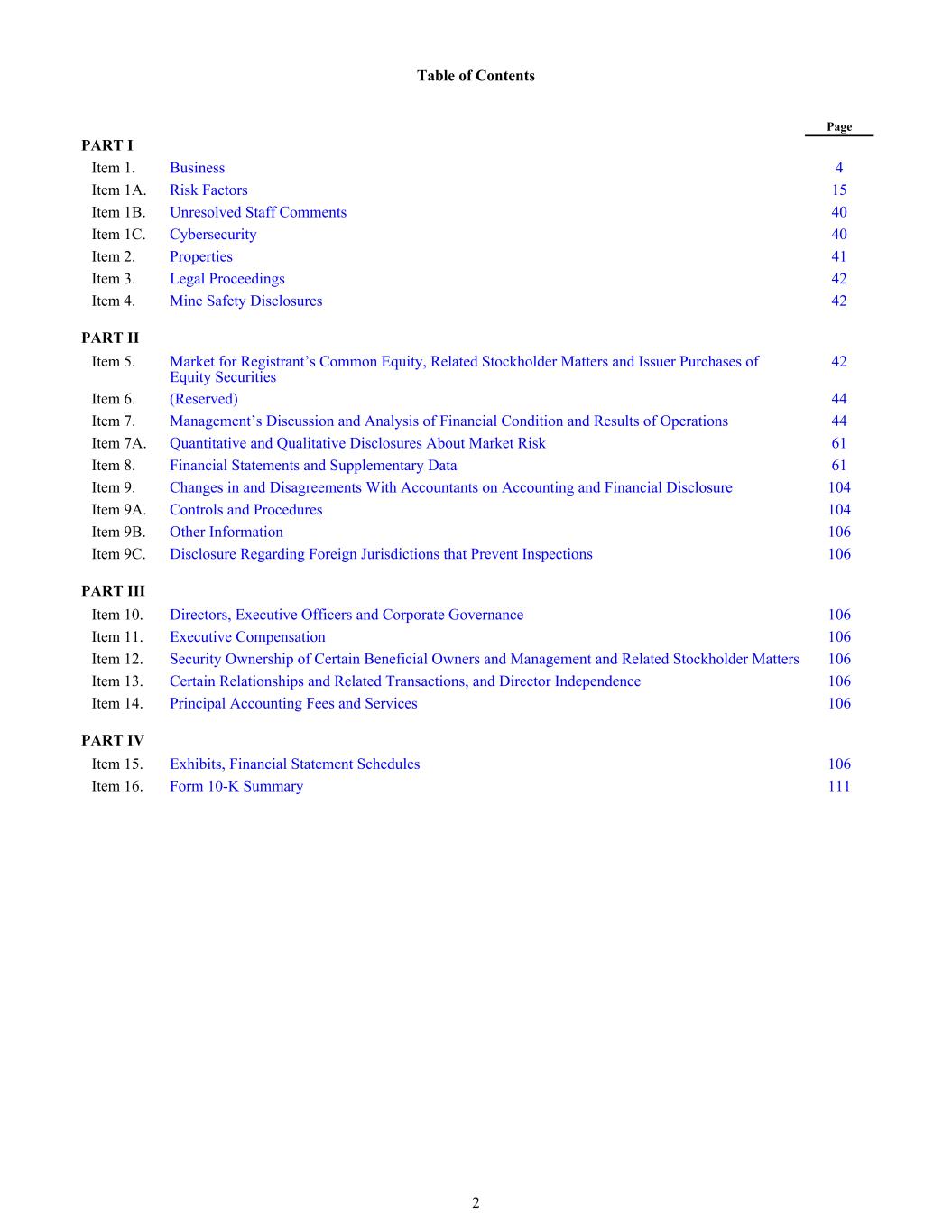 Table of Contents Page PART I Item 1. Business 4 Item 1A. Risk Factors 15 Item 1B. Unresolved Staff Comments 40 Item 1C. Cybersecurity 40 Item 2. Properties 41 Item 3. Legal Proceedings 42 Item 4. Mine Safety Disclosures 42 PART II Item 5. Market for Registrant’s Common Equity, Related Stockholder Matters and Issuer Purchases of Equity Securities 42 Item 6. (Reserved) 44 Item 7. Management’s Discussion and Analysis of Financial Condition and Results of Operations 44 Item 7A. Quantitative and Qualitative Disclosures About Market Risk 61 Item 8. Financial Statements and Supplementary Data 61 Item 9. Changes in and Disagreements With Accountants on Accounting and Financial Disclosure 104 Item 9A. Controls and Procedures 104 Item 9B. Other Information 106 Item 9C. Disclosure Regarding Foreign Jurisdictions that Prevent Inspections 106 PART III Item 10. Directors, Executive Officers and Corporate Governance 106 Item 11. Executive Compensation 106 Item 12. Security Ownership of Certain Beneficial Owners and Management and Related Stockholder Matters 106 Item 13. Certain Relationships and Related Transactions, and Director Independence 106 Item 14. Principal Accounting Fees and Services 106 PART IV Item 15. Exhibits, Financial Statement Schedules 106 Item 16. Form 10-K Summary 111 2