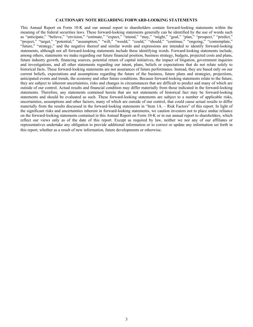 CAUTIONARY NOTE REGARDING FORWARD-LOOKING STATEMENTS This Annual Report on Form 10-K and our annual report to shareholders contain forward-looking statements within the meaning of the federal securities laws. These forward-looking statements generally can be identified by the use of words such as “anticipate,” “believe,” “envision,” “estimate,” “expect,” “intend,” “may,” “might,” “goal,” “plan,” “prospect,” “predict,” “project,” “target,” “potential,” “assumption,” “will,” “would,” “could,” “should,” “continue,” “ongoing,” “contemplate,” “future,” “strategy,” and the negative thereof and similar words and expressions are intended to identify forward-looking statements, although not all forward-looking statements include these identifying words. Forward-looking statements include, among others, statements we make regarding our future financial position, business strategy, budgets, projected costs and plans, future industry growth, financing sources, potential return of capital initiatives, the impact of litigation, government inquiries and investigations, and all other statements regarding our intent, plans, beliefs or expectations that do not relate solely to historical facts. These forward-looking statements are not assurances of future performance. Instead, they are based only on our current beliefs, expectations and assumptions regarding the future of the business, future plans and strategies, projections, anticipated events and trends, the economy and other future conditions. Because forward-looking statements relate to the future, they are subject to inherent uncertainties, risks and changes in circumstances that are difficult to predict and many of which are outside of our control. Actual results and financial condition may differ materially from those indicated in the forward-looking statements. Therefore, any statements contained herein that are not statements of historical fact may be forward-looking statements and should be evaluated as such. These forward-looking statements are subject to a number of applicable risks, uncertainties, assumptions and other factors, many of which are outside of our control, that could cause actual results to differ materially from the results discussed in the forward-looking statements in “Item 1A. – Risk Factors” of this report. In light of the significant risks and uncertainties inherent in forward-looking statements, we caution investors not to place undue reliance on the forward-looking statements contained in this Annual Report on Form 10-K or in our annual report to shareholders, which reflect our views only as of the date of this report. Except as required by law, neither we nor any of our affiliates or representatives undertake any obligation to provide additional information or to correct or update any information set forth in this report, whether as a result of new information, future developments or otherwise. 3