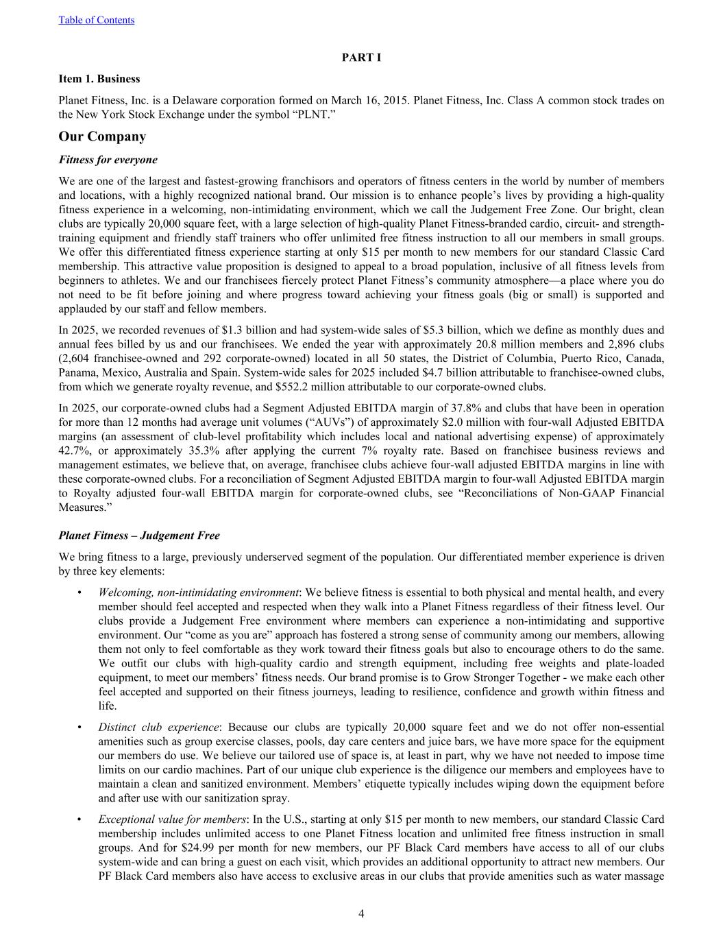 PART I Item 1. Business Planet Fitness, Inc. is a Delaware corporation formed on March 16, 2015. Planet Fitness, Inc. Class A common stock trades on the New York Stock Exchange under the symbol “PLNT.” Our Company Fitness for everyone We are one of the largest and fastest-growing franchisors and operators of fitness centers in the world by number of members and locations, with a highly recognized national brand. Our mission is to enhance people’s lives by providing a high-quality fitness experience in a welcoming, non-intimidating environment, which we call the Judgement Free Zone. Our bright, clean clubs are typically 20,000 square feet, with a large selection of high-quality Planet Fitness-branded cardio, circuit- and strength- training equipment and friendly staff trainers who offer unlimited free fitness instruction to all our members in small groups. We offer this differentiated fitness experience starting at only $15 per month to new members for our standard Classic Card membership. This attractive value proposition is designed to appeal to a broad population, inclusive of all fitness levels from beginners to athletes. We and our franchisees fiercely protect Planet Fitness’s community atmosphere—a place where you do not need to be fit before joining and where progress toward achieving your fitness goals (big or small) is supported and applauded by our staff and fellow members. In 2025, we recorded revenues of $1.3 billion and had system-wide sales of $5.3 billion, which we define as monthly dues and annual fees billed by us and our franchisees. We ended the year with approximately 20.8 million members and 2,896 clubs (2,604 franchisee-owned and 292 corporate-owned) located in all 50 states, the District of Columbia, Puerto Rico, Canada, Panama, Mexico, Australia and Spain. System-wide sales for 2025 included $4.7 billion attributable to franchisee-owned clubs, from which we generate royalty revenue, and $552.2 million attributable to our corporate-owned clubs. In 2025, our corporate-owned clubs had a Segment Adjusted EBITDA margin of 37.8% and clubs that have been in operation for more than 12 months had average unit volumes (“AUVs”) of approximately $2.0 million with four-wall Adjusted EBITDA margins (an assessment of club-level profitability which includes local and national advertising expense) of approximately 42.7%, or approximately 35.3% after applying the current 7% royalty rate. Based on franchisee business reviews and management estimates, we believe that, on average, franchisee clubs achieve four-wall adjusted EBITDA margins in line with these corporate-owned clubs. For a reconciliation of Segment Adjusted EBITDA margin to four-wall Adjusted EBITDA margin to Royalty adjusted four-wall EBITDA margin for corporate-owned clubs, see “Reconciliations of Non-GAAP Financial Measures.” Planet Fitness – Judgement Free We bring fitness to a large, previously underserved segment of the population. Our differentiated member experience is driven by three key elements: • Welcoming, non-intimidating environment: We believe fitness is essential to both physical and mental health, and every member should feel accepted and respected when they walk into a Planet Fitness regardless of their fitness level. Our clubs provide a Judgement Free environment where members can experience a non-intimidating and supportive environment. Our “come as you are” approach has fostered a strong sense of community among our members, allowing them not only to feel comfortable as they work toward their fitness goals but also to encourage others to do the same. We outfit our clubs with high-quality cardio and strength equipment, including free weights and plate-loaded equipment, to meet our members’ fitness needs. Our brand promise is to Grow Stronger Together - we make each other feel accepted and supported on their fitness journeys, leading to resilience, confidence and growth within fitness and life. • Distinct club experience: Because our clubs are typically 20,000 square feet and we do not offer non-essential amenities such as group exercise classes, pools, day care centers and juice bars, we have more space for the equipment our members do use. We believe our tailored use of space is, at least in part, why we have not needed to impose time limits on our cardio machines. Part of our unique club experience is the diligence our members and employees have to maintain a clean and sanitized environment. Members’ etiquette typically includes wiping down the equipment before and after use with our sanitization spray. • Exceptional value for members: In the U.S., starting at only $15 per month to new members, our standard Classic Card membership includes unlimited access to one Planet Fitness location and unlimited free fitness instruction in small groups. And for $24.99 per month for new members, our PF Black Card members have access to all of our clubs system-wide and can bring a guest on each visit, which provides an additional opportunity to attract new members. Our PF Black Card members also have access to exclusive areas in our clubs that provide amenities such as water massage Table of Contents 4