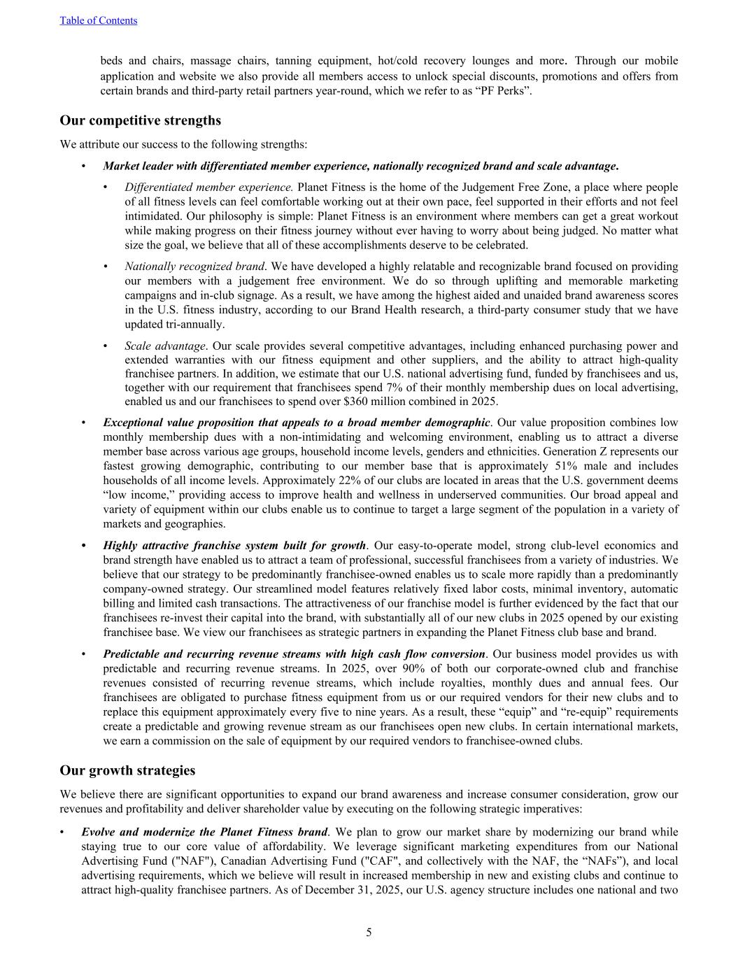 beds and chairs, massage chairs, tanning equipment, hot/cold recovery lounges and more. Through our mobile application and website we also provide all members access to unlock special discounts, promotions and offers from certain brands and third-party retail partners year-round, which we refer to as “PF Perks”. Our competitive strengths We attribute our success to the following strengths: • Market leader with differentiated member experience, nationally recognized brand and scale advantage. • Differentiated member experience. Planet Fitness is the home of the Judgement Free Zone, a place where people of all fitness levels can feel comfortable working out at their own pace, feel supported in their efforts and not feel intimidated. Our philosophy is simple: Planet Fitness is an environment where members can get a great workout while making progress on their fitness journey without ever having to worry about being judged. No matter what size the goal, we believe that all of these accomplishments deserve to be celebrated. • Nationally recognized brand. We have developed a highly relatable and recognizable brand focused on providing our members with a judgement free environment. We do so through uplifting and memorable marketing campaigns and in-club signage. As a result, we have among the highest aided and unaided brand awareness scores in the U.S. fitness industry, according to our Brand Health research, a third-party consumer study that we have updated tri-annually. • Scale advantage. Our scale provides several competitive advantages, including enhanced purchasing power and extended warranties with our fitness equipment and other suppliers, and the ability to attract high-quality franchisee partners. In addition, we estimate that our U.S. national advertising fund, funded by franchisees and us, together with our requirement that franchisees spend 7% of their monthly membership dues on local advertising, enabled us and our franchisees to spend over $360 million combined in 2025. • Exceptional value proposition that appeals to a broad member demographic. Our value proposition combines low monthly membership dues with a non-intimidating and welcoming environment, enabling us to attract a diverse member base across various age groups, household income levels, genders and ethnicities. Generation Z represents our fastest growing demographic, contributing to our member base that is approximately 51% male and includes households of all income levels. Approximately 22% of our clubs are located in areas that the U.S. government deems “low income,” providing access to improve health and wellness in underserved communities. Our broad appeal and variety of equipment within our clubs enable us to continue to target a large segment of the population in a variety of markets and geographies. • Highly attractive franchise system built for growth. Our easy-to-operate model, strong club-level economics and brand strength have enabled us to attract a team of professional, successful franchisees from a variety of industries. We believe that our strategy to be predominantly franchisee-owned enables us to scale more rapidly than a predominantly company-owned strategy. Our streamlined model features relatively fixed labor costs, minimal inventory, automatic billing and limited cash transactions. The attractiveness of our franchise model is further evidenced by the fact that our franchisees re-invest their capital into the brand, with substantially all of our new clubs in 2025 opened by our existing franchisee base. We view our franchisees as strategic partners in expanding the Planet Fitness club base and brand. • Predictable and recurring revenue streams with high cash flow conversion. Our business model provides us with predictable and recurring revenue streams. In 2025, over 90% of both our corporate-owned club and franchise revenues consisted of recurring revenue streams, which include royalties, monthly dues and annual fees. Our franchisees are obligated to purchase fitness equipment from us or our required vendors for their new clubs and to replace this equipment approximately every five to nine years. As a result, these “equip” and “re-equip” requirements create a predictable and growing revenue stream as our franchisees open new clubs. In certain international markets, we earn a commission on the sale of equipment by our required vendors to franchisee-owned clubs. Our growth strategies We believe there are significant opportunities to expand our brand awareness and increase consumer consideration, grow our revenues and profitability and deliver shareholder value by executing on the following strategic imperatives: • Evolve and modernize the Planet Fitness brand. We plan to grow our market share by modernizing our brand while staying true to our core value of affordability. We leverage significant marketing expenditures from our National Advertising Fund ("NAF"), Canadian Advertising Fund ("CAF", and collectively with the NAF, the “NAFs”), and local advertising requirements, which we believe will result in increased membership in new and existing clubs and continue to attract high-quality franchisee partners. As of December 31, 2025, our U.S. agency structure includes one national and two Table of Contents 5