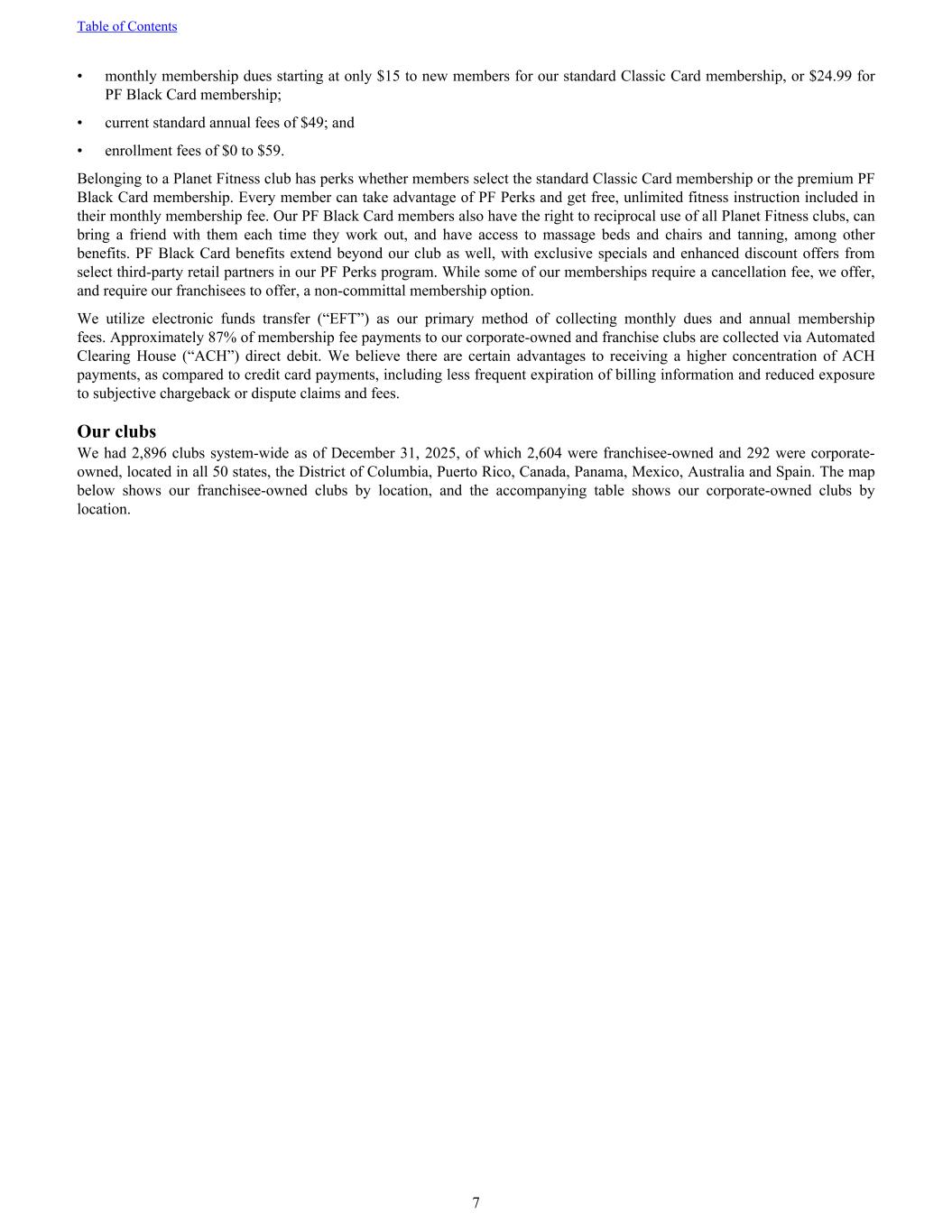 • monthly membership dues starting at only $15 to new members for our standard Classic Card membership, or $24.99 for PF Black Card membership; • current standard annual fees of $49; and • enrollment fees of $0 to $59. Belonging to a Planet Fitness club has perks whether members select the standard Classic Card membership or the premium PF Black Card membership. Every member can take advantage of PF Perks and get free, unlimited fitness instruction included in their monthly membership fee. Our PF Black Card members also have the right to reciprocal use of all Planet Fitness clubs, can bring a friend with them each time they work out, and have access to massage beds and chairs and tanning, among other benefits. PF Black Card benefits extend beyond our club as well, with exclusive specials and enhanced discount offers from select third-party retail partners in our PF Perks program. While some of our memberships require a cancellation fee, we offer, and require our franchisees to offer, a non-committal membership option. We utilize electronic funds transfer (“EFT”) as our primary method of collecting monthly dues and annual membership fees. Approximately 87% of membership fee payments to our corporate-owned and franchise clubs are collected via Automated Clearing House (“ACH”) direct debit. We believe there are certain advantages to receiving a higher concentration of ACH payments, as compared to credit card payments, including less frequent expiration of billing information and reduced exposure to subjective chargeback or dispute claims and fees. Our clubs We had 2,896 clubs system-wide as of December 31, 2025, of which 2,604 were franchisee-owned and 292 were corporate- owned, located in all 50 states, the District of Columbia, Puerto Rico, Canada, Panama, Mexico, Australia and Spain. The map below shows our franchisee-owned clubs by location, and the accompanying table shows our corporate-owned clubs by location. Table of Contents 7