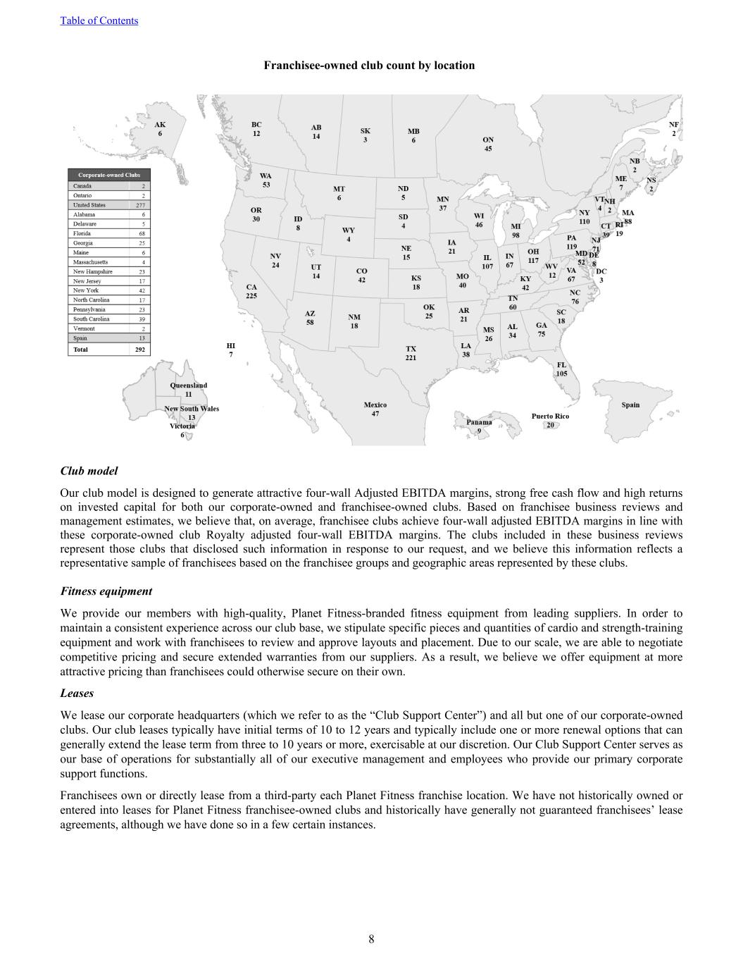 Franchisee-owned club count by location Club model Our club model is designed to generate attractive four-wall Adjusted EBITDA margins, strong free cash flow and high returns on invested capital for both our corporate-owned and franchisee-owned clubs. Based on franchisee business reviews and management estimates, we believe that, on average, franchisee clubs achieve four-wall adjusted EBITDA margins in line with these corporate-owned club Royalty adjusted four-wall EBITDA margins. The clubs included in these business reviews represent those clubs that disclosed such information in response to our request, and we believe this information reflects a representative sample of franchisees based on the franchisee groups and geographic areas represented by these clubs. Fitness equipment We provide our members with high-quality, Planet Fitness-branded fitness equipment from leading suppliers. In order to maintain a consistent experience across our club base, we stipulate specific pieces and quantities of cardio and strength-training equipment and work with franchisees to review and approve layouts and placement. Due to our scale, we are able to negotiate competitive pricing and secure extended warranties from our suppliers. As a result, we believe we offer equipment at more attractive pricing than franchisees could otherwise secure on their own. Leases We lease our corporate headquarters (which we refer to as the “Club Support Center”) and all but one of our corporate-owned clubs. Our club leases typically have initial terms of 10 to 12 years and typically include one or more renewal options that can generally extend the lease term from three to 10 years or more, exercisable at our discretion. Our Club Support Center serves as our base of operations for substantially all of our executive management and employees who provide our primary corporate support functions. Franchisees own or directly lease from a third-party each Planet Fitness franchise location. We have not historically owned or entered into leases for Planet Fitness franchisee-owned clubs and historically have generally not guaranteed franchisees’ lease agreements, although we have done so in a few certain instances. Table of Contents 8