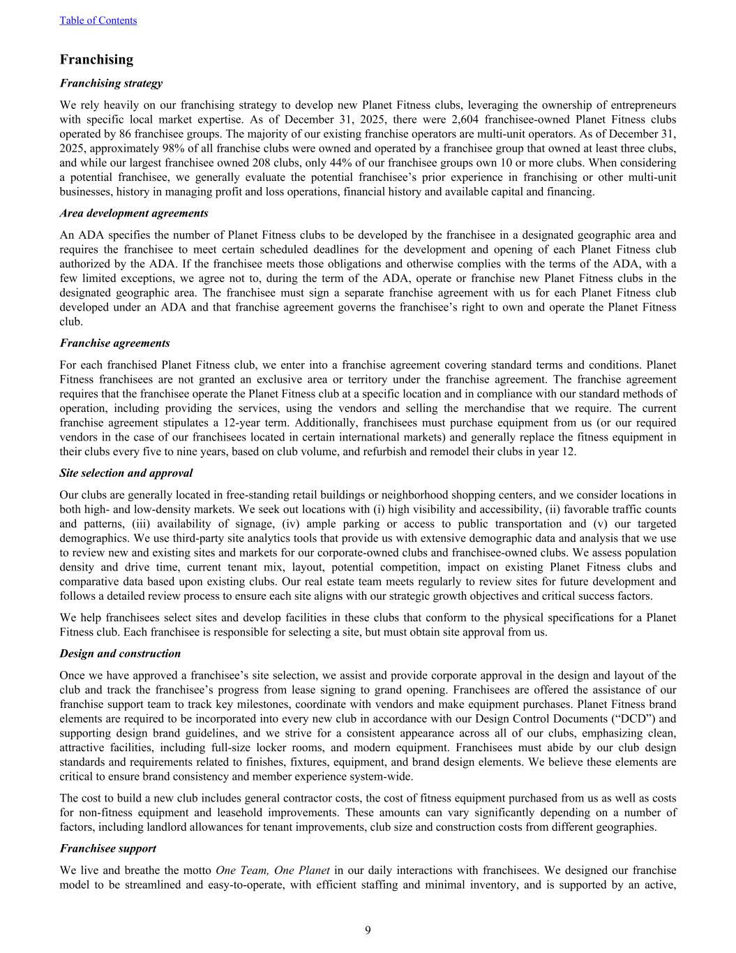 Franchising Franchising strategy We rely heavily on our franchising strategy to develop new Planet Fitness clubs, leveraging the ownership of entrepreneurs with specific local market expertise. As of December 31, 2025, there were 2,604 franchisee-owned Planet Fitness clubs operated by 86 franchisee groups. The majority of our existing franchise operators are multi-unit operators. As of December 31, 2025, approximately 98% of all franchise clubs were owned and operated by a franchisee group that owned at least three clubs, and while our largest franchisee owned 208 clubs, only 44% of our franchisee groups own 10 or more clubs. When considering a potential franchisee, we generally evaluate the potential franchisee’s prior experience in franchising or other multi-unit businesses, history in managing profit and loss operations, financial history and available capital and financing. Area development agreements An ADA specifies the number of Planet Fitness clubs to be developed by the franchisee in a designated geographic area and requires the franchisee to meet certain scheduled deadlines for the development and opening of each Planet Fitness club authorized by the ADA. If the franchisee meets those obligations and otherwise complies with the terms of the ADA, with a few limited exceptions, we agree not to, during the term of the ADA, operate or franchise new Planet Fitness clubs in the designated geographic area. The franchisee must sign a separate franchise agreement with us for each Planet Fitness club developed under an ADA and that franchise agreement governs the franchisee’s right to own and operate the Planet Fitness club. Franchise agreements For each franchised Planet Fitness club, we enter into a franchise agreement covering standard terms and conditions. Planet Fitness franchisees are not granted an exclusive area or territory under the franchise agreement. The franchise agreement requires that the franchisee operate the Planet Fitness club at a specific location and in compliance with our standard methods of operation, including providing the services, using the vendors and selling the merchandise that we require. The current franchise agreement stipulates a 12-year term. Additionally, franchisees must purchase equipment from us (or our required vendors in the case of our franchisees located in certain international markets) and generally replace the fitness equipment in their clubs every five to nine years, based on club volume, and refurbish and remodel their clubs in year 12. Site selection and approval Our clubs are generally located in free-standing retail buildings or neighborhood shopping centers, and we consider locations in both high- and low-density markets. We seek out locations with (i) high visibility and accessibility, (ii) favorable traffic counts and patterns, (iii) availability of signage, (iv) ample parking or access to public transportation and (v) our targeted demographics. We use third-party site analytics tools that provide us with extensive demographic data and analysis that we use to review new and existing sites and markets for our corporate-owned clubs and franchisee-owned clubs. We assess population density and drive time, current tenant mix, layout, potential competition, impact on existing Planet Fitness clubs and comparative data based upon existing clubs. Our real estate team meets regularly to review sites for future development and follows a detailed review process to ensure each site aligns with our strategic growth objectives and critical success factors. We help franchisees select sites and develop facilities in these clubs that conform to the physical specifications for a Planet Fitness club. Each franchisee is responsible for selecting a site, but must obtain site approval from us. Design and construction Once we have approved a franchisee’s site selection, we assist and provide corporate approval in the design and layout of the club and track the franchisee’s progress from lease signing to grand opening. Franchisees are offered the assistance of our franchise support team to track key milestones, coordinate with vendors and make equipment purchases. Planet Fitness brand elements are required to be incorporated into every new club in accordance with our Design Control Documents (“DCD”) and supporting design brand guidelines, and we strive for a consistent appearance across all of our clubs, emphasizing clean, attractive facilities, including full-size locker rooms, and modern equipment. Franchisees must abide by our club design standards and requirements related to finishes, fixtures, equipment, and brand design elements. We believe these elements are critical to ensure brand consistency and member experience system-wide. The cost to build a new club includes general contractor costs, the cost of fitness equipment purchased from us as well as costs for non-fitness equipment and leasehold improvements. These amounts can vary significantly depending on a number of factors, including landlord allowances for tenant improvements, club size and construction costs from different geographies. Franchisee support We live and breathe the motto One Team, One Planet in our daily interactions with franchisees. We designed our franchise model to be streamlined and easy-to-operate, with efficient staffing and minimal inventory, and is supported by an active, Table of Contents 9