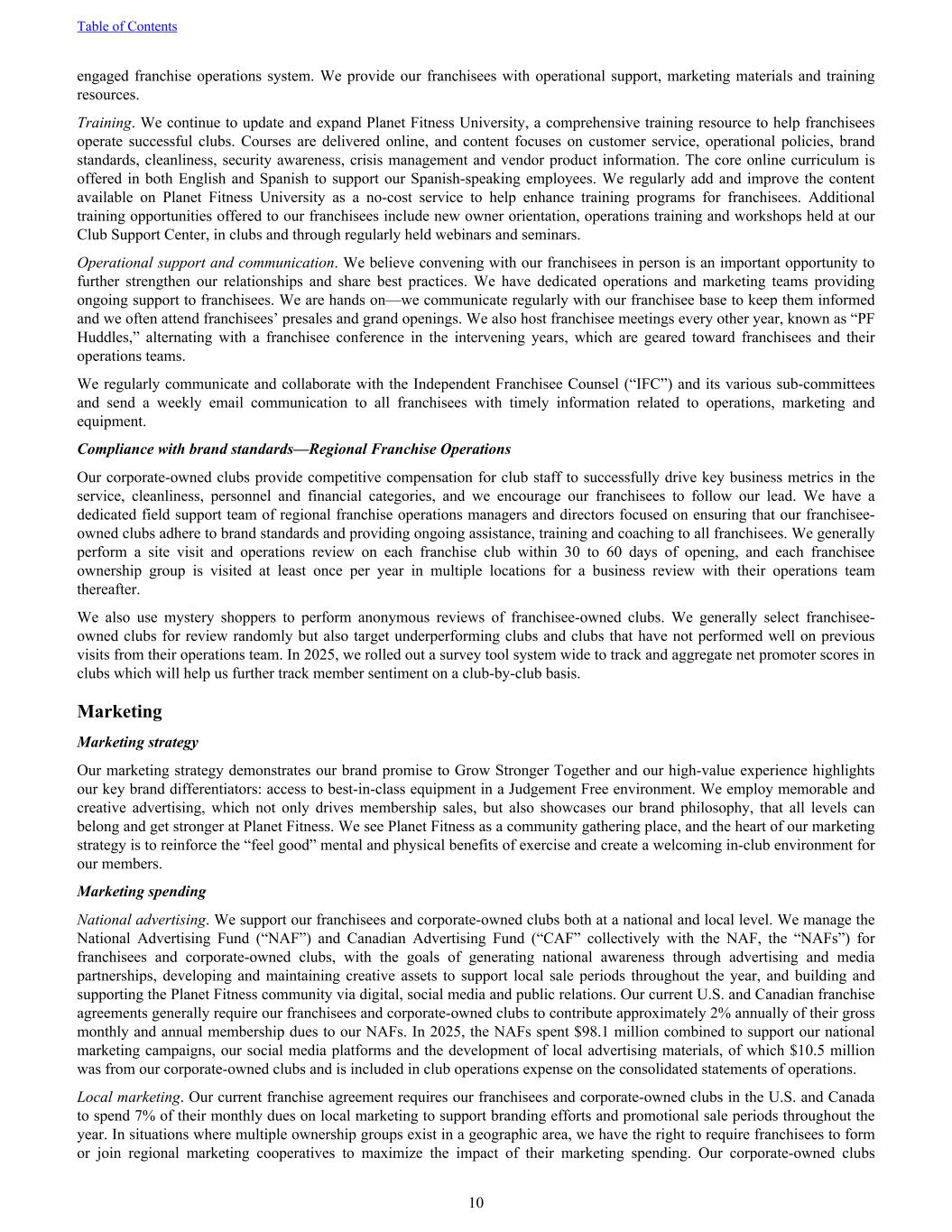 engaged franchise operations system. We provide our franchisees with operational support, marketing materials and training resources. Training. We continue to update and expand Planet Fitness University, a comprehensive training resource to help franchisees operate successful clubs. Courses are delivered online, and content focuses on customer service, operational policies, brand standards, cleanliness, security awareness, crisis management and vendor product information. The core online curriculum is offered in both English and Spanish to support our Spanish-speaking employees. We regularly add and improve the content available on Planet Fitness University as a no-cost service to help enhance training programs for franchisees. Additional training opportunities offered to our franchisees include new owner orientation, operations training and workshops held at our Club Support Center, in clubs and through regularly held webinars and seminars. Operational support and communication. We believe convening with our franchisees in person is an important opportunity to further strengthen our relationships and share best practices. We have dedicated operations and marketing teams providing ongoing support to franchisees. We are hands on—we communicate regularly with our franchisee base to keep them informed and we often attend franchisees’ presales and grand openings. We also host franchisee meetings every other year, known as “PF Huddles,” alternating with a franchisee conference in the intervening years, which are geared toward franchisees and their operations teams. We regularly communicate and collaborate with the Independent Franchisee Counsel (“IFC”) and its various sub-committees and send a weekly email communication to all franchisees with timely information related to operations, marketing and equipment. Compliance with brand standards—Regional Franchise Operations Our corporate-owned clubs provide competitive compensation for club staff to successfully drive key business metrics in the service, cleanliness, personnel and financial categories, and we encourage our franchisees to follow our lead. We have a dedicated field support team of regional franchise operations managers and directors focused on ensuring that our franchisee- owned clubs adhere to brand standards and providing ongoing assistance, training and coaching to all franchisees. We generally perform a site visit and operations review on each franchise club within 30 to 60 days of opening, and each franchisee ownership group is visited at least once per year in multiple locations for a business review with their operations team thereafter. We also use mystery shoppers to perform anonymous reviews of franchisee-owned clubs. We generally select franchisee- owned clubs for review randomly but also target underperforming clubs and clubs that have not performed well on previous visits from their operations team. In 2025, we rolled out a survey tool system wide to track and aggregate net promoter scores in clubs which will help us further track member sentiment on a club-by-club basis. Marketing Marketing strategy Our marketing strategy demonstrates our brand promise to Grow Stronger Together and our high-value experience highlights our key brand differentiators: access to best-in-class equipment in a Judgement Free environment. We employ memorable and creative advertising, which not only drives membership sales, but also showcases our brand philosophy, that all levels can belong and get stronger at Planet Fitness. We see Planet Fitness as a community gathering place, and the heart of our marketing strategy is to reinforce the “feel good” mental and physical benefits of exercise and create a welcoming in-club environment for our members. Marketing spending National advertising. We support our franchisees and corporate-owned clubs both at a national and local level. We manage the National Advertising Fund (“NAF”) and Canadian Advertising Fund (“CAF” collectively with the NAF, the “NAFs”) for franchisees and corporate-owned clubs, with the goals of generating national awareness through advertising and media partnerships, developing and maintaining creative assets to support local sale periods throughout the year, and building and supporting the Planet Fitness community via digital, social media and public relations. Our current U.S. and Canadian franchise agreements generally require our franchisees and corporate-owned clubs to contribute approximately 2% annually of their gross monthly and annual membership dues to our NAFs. In 2025, the NAFs spent $98.1 million combined to support our national marketing campaigns, our social media platforms and the development of local advertising materials, of which $10.5 million was from our corporate-owned clubs and is included in club operations expense on the consolidated statements of operations. Local marketing. Our current franchise agreement requires our franchisees and corporate-owned clubs in the U.S. and Canada to spend 7% of their monthly dues on local marketing to support branding efforts and promotional sale periods throughout the year. In situations where multiple ownership groups exist in a geographic area, we have the right to require franchisees to form or join regional marketing cooperatives to maximize the impact of their marketing spending. Our corporate-owned clubs Table of Contents 10