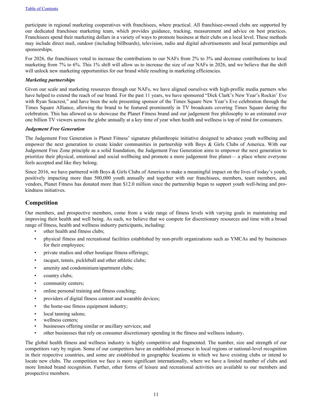 participate in regional marketing cooperatives with franchisees, where practical. All franchisee-owned clubs are supported by our dedicated franchisee marketing team, which provides guidance, tracking, measurement and advice on best practices. Franchisees spend their marketing dollars in a variety of ways to promote business at their clubs on a local level. These methods may include direct mail, outdoor (including billboards), television, radio and digital advertisements and local partnerships and sponsorships. For 2026, the franchisees voted to increase the contributions to our NAFs from 2% to 3% and decrease contributions to local marketing from 7% to 6%. This 1% shift will allow us to increase the size of our NAFs in 2026, and we believe that the shift will unlock new marketing opportunities for our brand while resulting in marketing efficiencies. Marketing partnerships Given our scale and marketing resources through our NAFs, we have aligned ourselves with high-profile media partners who have helped to extend the reach of our brand. For the past 11 years, we have sponsored “Dick Clark’s New Year’s Rockin’ Eve with Ryan Seacrest,” and have been the sole presenting sponsor of the Times Square New Year’s Eve celebration through the Times Square Alliance, allowing the brand to be featured prominently in TV broadcasts covering Times Square during the celebration. This has allowed us to showcase the Planet Fitness brand and our judgement free philosophy to an estimated over one billion TV viewers across the globe annually at a key time of year when health and wellness is top of mind for consumers. Judgement Free Generation The Judgement Free Generation is Planet Fitness’ signature philanthropic initiative designed to advance youth wellbeing and empower the next generation to create kinder communities in partnership with Boys & Girls Clubs of America. With our Judgement Free Zone principle as a solid foundation, the Judgement Free Generation aims to empower the next generation to prioritize their physical, emotional and social wellbeing and promote a more judgement free planet— a place where everyone feels accepted and like they belong. Since 2016, we have partnered with Boys & Girls Clubs of America to make a meaningful impact on the lives of today’s youth, positively impacting more than 500,000 youth annually and together with our franchisees, members, team members, and vendors, Planet Fitness has donated more than $12.0 million since the partnership began to support youth well-being and pro- kindness initiatives. Competition Our members, and prospective members, come from a wide range of fitness levels with varying goals in maintaining and improving their health and well being. As such, we believe that we compete for discretionary resources and time with a broad range of fitness, health and wellness industry participants, including: • other health and fitness clubs; • physical fitness and recreational facilities established by non-profit organizations such as YMCAs and by businesses for their employees; • private studios and other boutique fitness offerings; • racquet, tennis, pickleball and other athletic clubs; • amenity and condominium/apartment clubs; • country clubs; • community centers; • online personal training and fitness coaching; • providers of digital fitness content and wearable devices; • the home-use fitness equipment industry; • local tanning salons; • wellness centers; • businesses offering similar or ancillary services; and • other businesses that rely on consumer discretionary spending in the fitness and wellness industry. The global health fitness and wellness industry is highly competitive and fragmented. The number, size and strength of our competitors vary by region. Some of our competitors have an established presence in local regions or national-level recognition in their respective countries, and some are established in geographic locations in which we have existing clubs or intend to locate new clubs. The competition we face is more significant internationally, where we have a limited number of clubs and more limited brand recognition. Further, other forms of leisure and recreational activities are available to our members and prospective members. Table of Contents 11